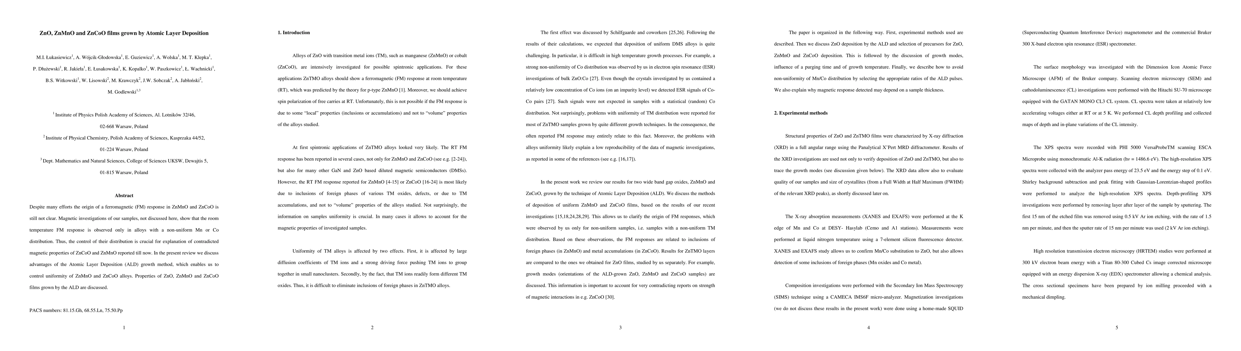 This paper discusses the growth of ZnO, ZnMnO, and ZnCoO films using Atomic Layer Deposition (ALD) to control the distribution of Mn or Co, which is crucial for explaining the contradictory magnetic properties observed in these materials. The ALD method allows for precise control over alloy uniformity, potentially resolving the origin of ferromagnetic responses in these films.