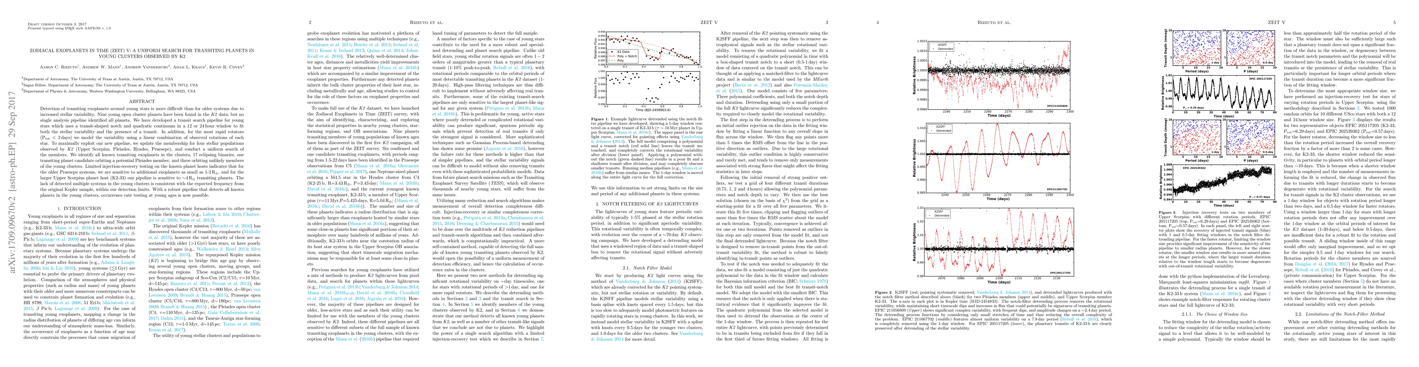 The ZEIT V study developed a specialized transit search pipeline to detect exoplanets in young clusters, identifying nine transiting planets and one candidate. The pipeline is sensitive to planets as small as 1-2 Earth radii in older clusters and up to 4 Earth radii in larger systems, enabling future occurrence rate studies in young stellar populations.