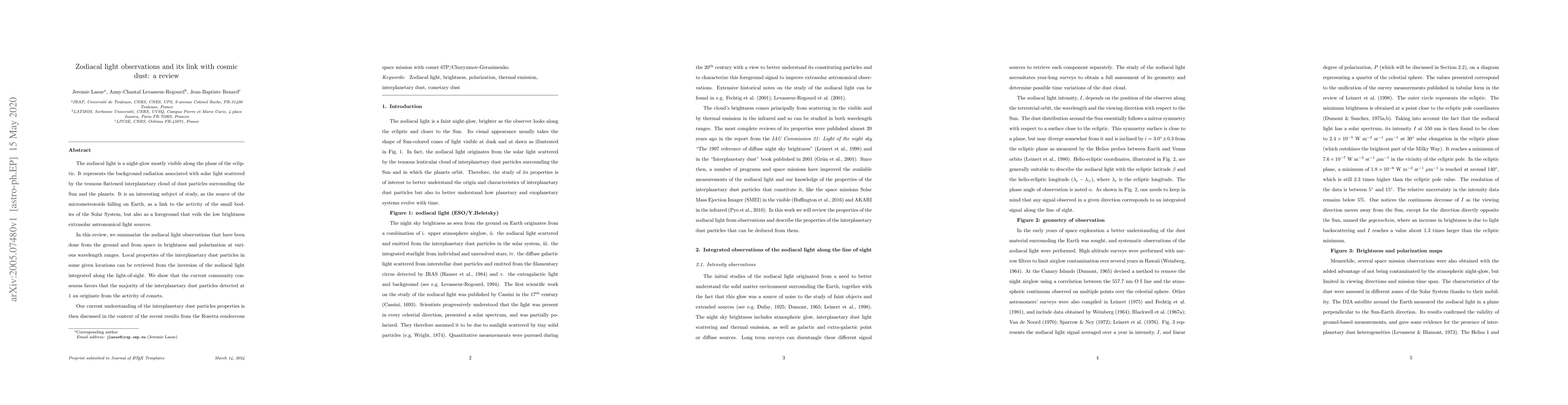 This review summarizes observations of the zodiacal light, a faint night-glow caused by interplanetary dust scattering solar light, and discusses its link to cosmic dust. It highlights the consensus that most detected dust originates from cometary activity, supported by findings from the Rosetta mission.