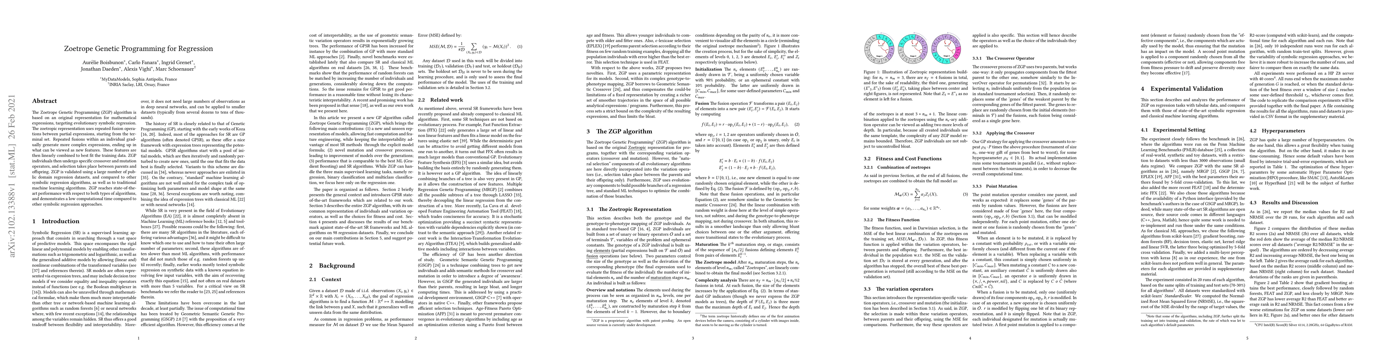 The Zoetrope Genetic Programming (ZGP) algorithm is based on an original representation for mathematical expressions, targeting evolutionary symbolic regression.The zoetropic representation uses repeated fusion operations between partial expressions, starting from the terminal set. Repeated fusions within an individual gradually generate more complex expressions, ending up in what can be viewed as new features. These features are then linearly combined to best fit the training data. ZGP individuals then undergo specific crossover and mutation operators, and selection takes place between parents and offspring. ZGP is validated using a large number of public domain regression datasets, and compared to other symbolic regression algorithms, as well as to traditional machine learning algorithms. ZGP reaches state-of-the-art performance with respect to both types of algorithms, and demonstrates a low computational time compared to other symbolic regression approaches.