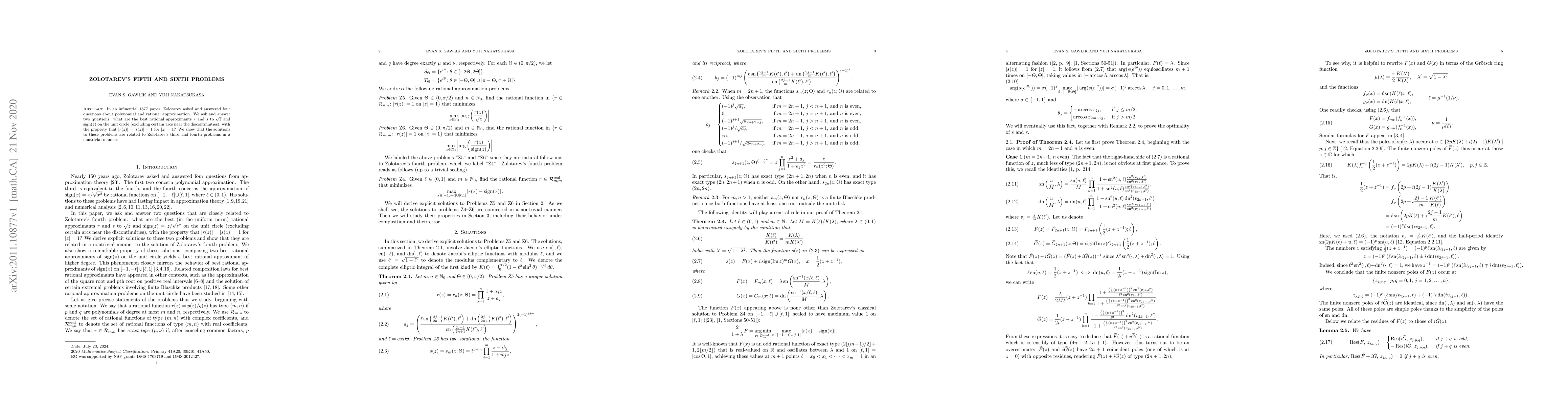 In an influential 1877 paper, Zolotarev asked and answered four questions about polynomial and rational approximation. We ask and answer two questions: what are the best rational approximants $r$ and $s$ to $\sqrt{z}$ and $\mbox{sign}(z)$ on the unit circle (excluding certain arcs near the discontinuities), with the property that $|r(z)|=|s(z)|=1$ for $|z|=1$? We show that the solutions to these problems are related to Zolotarev's third and fourth problems in a nontrivial manner.