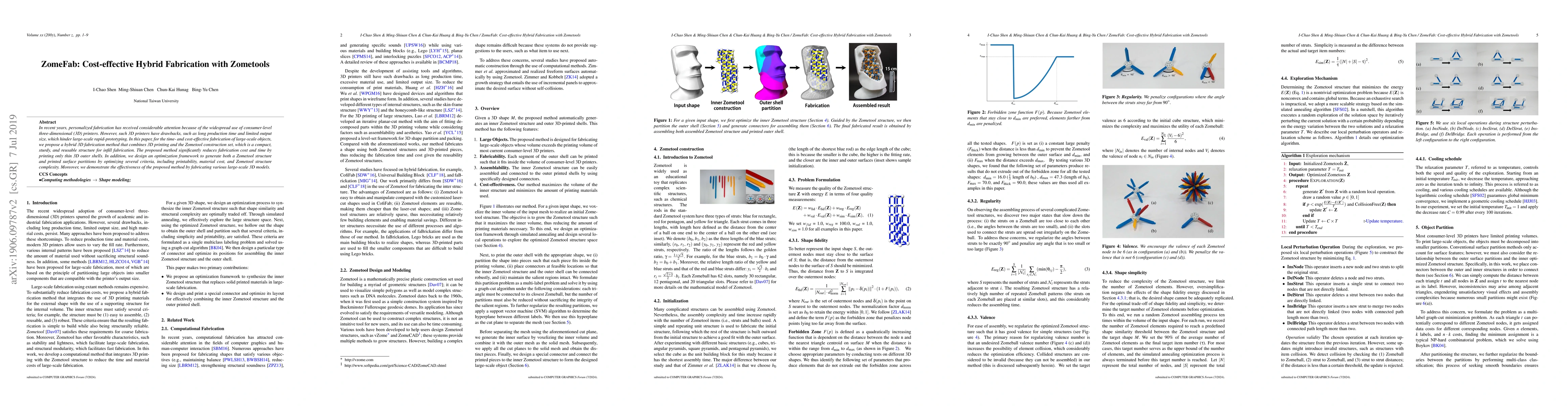 In recent years, personalized fabrication has received considerable attention because of the widespread use of consumer-level three-dimensional (3D) printers. However, such 3D printers have drawbacks, such as long production time and limited output size, which hinder large-scale rapid-prototyping. In this paper, for the time- and cost-effective fabrication of large-scale objects, we propose a hybrid 3D fabrication method that combines 3D printing and the Zometool construction set, which is a compact, sturdy, and reusable structure for infill fabrication. The proposed method significantly reduces fabrication cost and time by printing only thin 3D outer shells. In addition, we design an optimization framework to generate both a Zometool structure and printed surface partitions by optimizing several criteria, including printability, material cost, and Zometool structure complexity. Moreover, we demonstrate the effectiveness of the proposed method by fabricating various large-scale 3D models.