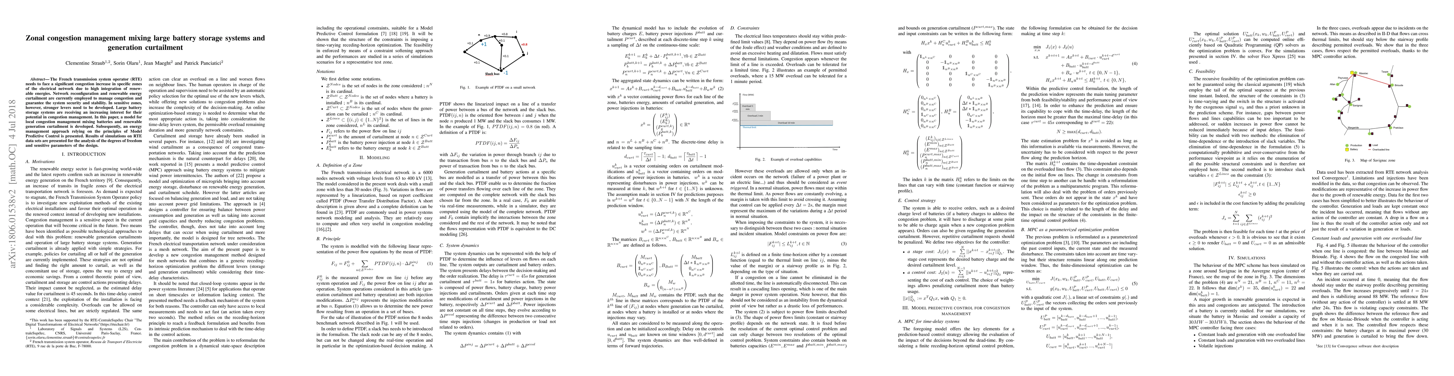 This paper develops a model for managing congestion in the French electrical network by combining large battery storage systems and curtailment of renewable energy generation. It employs Model Predictive Control for energy management, and simulation results on RTE data sets analyze the effectiveness of this approach.