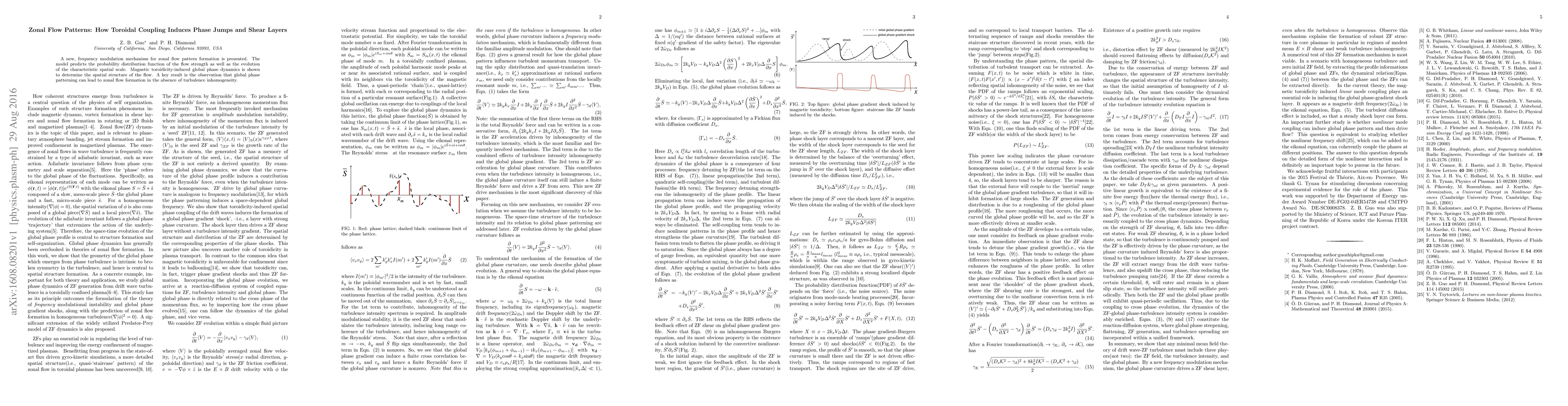 A new model predicts zonal flow patterns form through magnetic toroidicity-induced global phase dynamics, leading to phase jumps and shear layers in the absence of turbulence inhomogeneity.