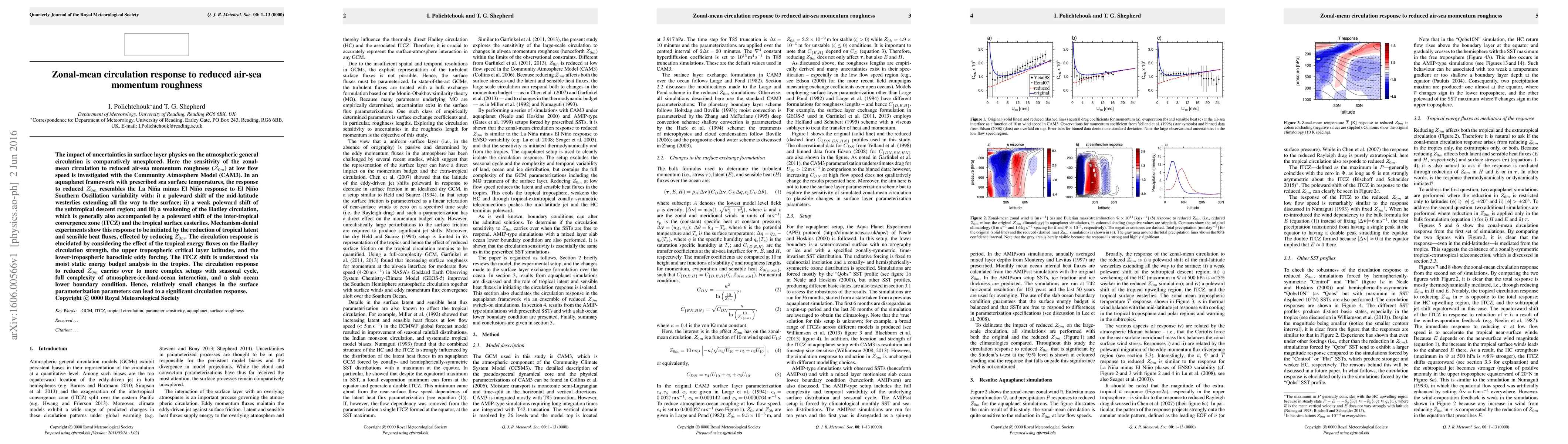 This study investigates the zonal-mean atmospheric circulation response to reduced air-sea momentum roughness using CAM3, finding a poleward shift in mid-latitude westerlies and a weakening of the Hadley circulation. The response mirrors La Niña conditions and is driven by reduced tropical latent and sensible heat fluxes.