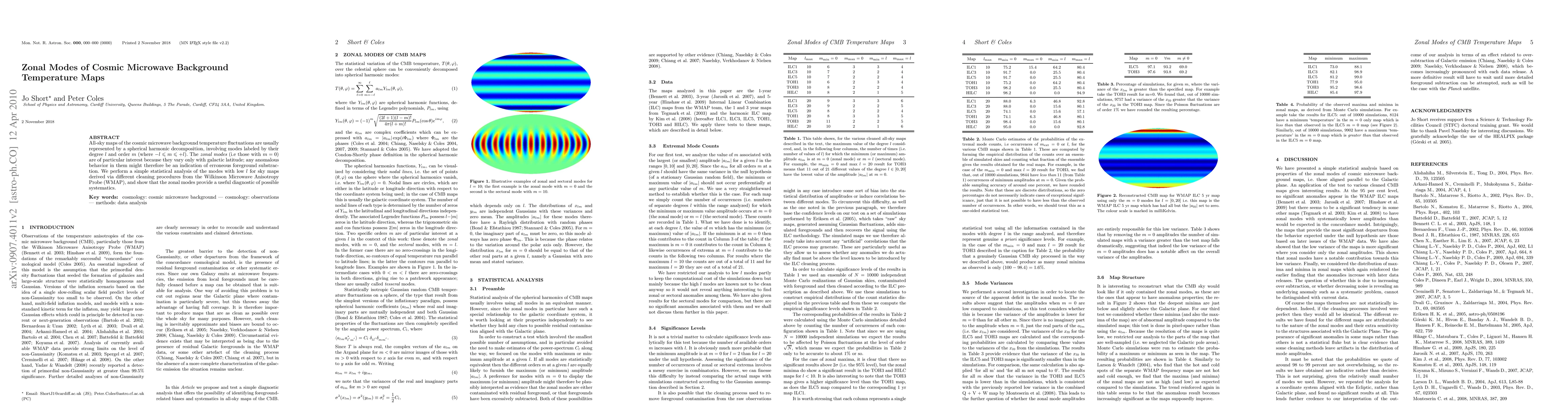 This paper analyzes zonal modes (m = 0) of cosmic microwave background temperature maps from WMAP data, finding they are useful for diagnosing potential systematic errors in foreground subtraction. The study highlights the significance of these modes in detecting anomalies indicative of data processing issues.