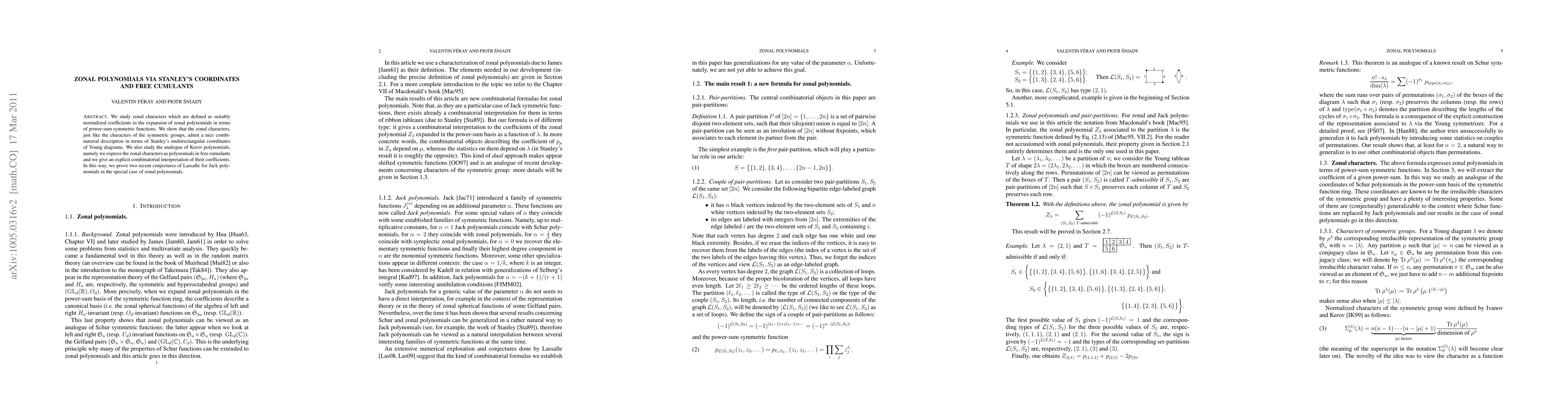 This paper explores zonal characters, revealing a combinatorial description in terms of Stanley's multirectangular coordinates. It also connects these characters to free cumulants, providing an explicit combinatorial interpretation of their coefficients and proving conjectures related to Jack polynomials for zonal polynomials.
