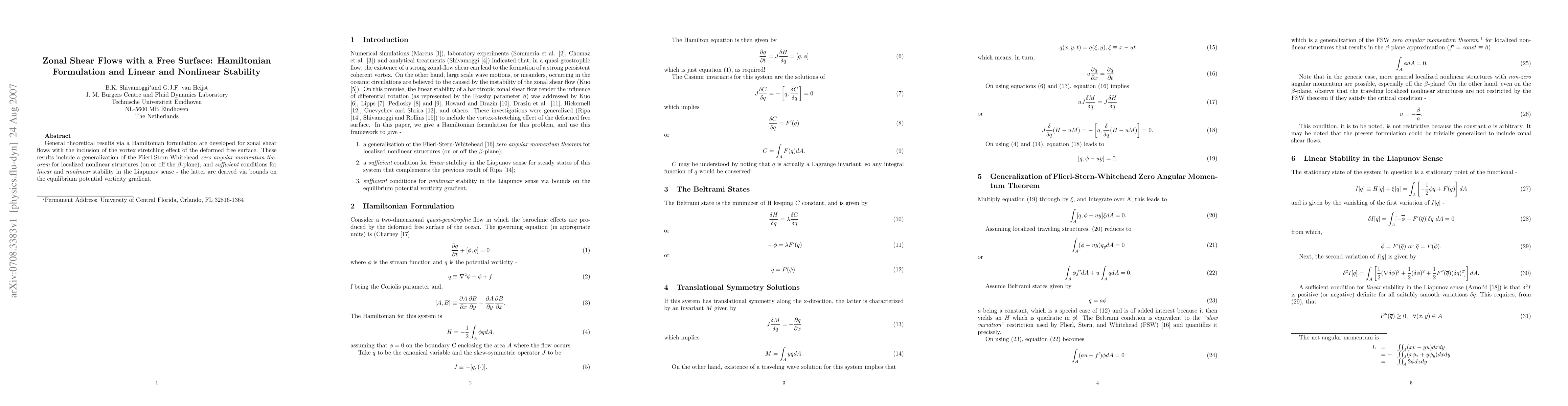 General theoretical results via a Hamiltonian formulation are developed for zonal shear flows with the inclusion of the vortex stretching effect of the deformed free surface. These results include a generalization of the Flierl-Stern-Whitehead zero angular momentum theorem} for localized nonlinear structures on or off the beta-plane, and sufficient conditions for linear and nonlinear stability in the Liapunov sense - the latter are derived via bounds on the equilibrium potential vorticity gradient.