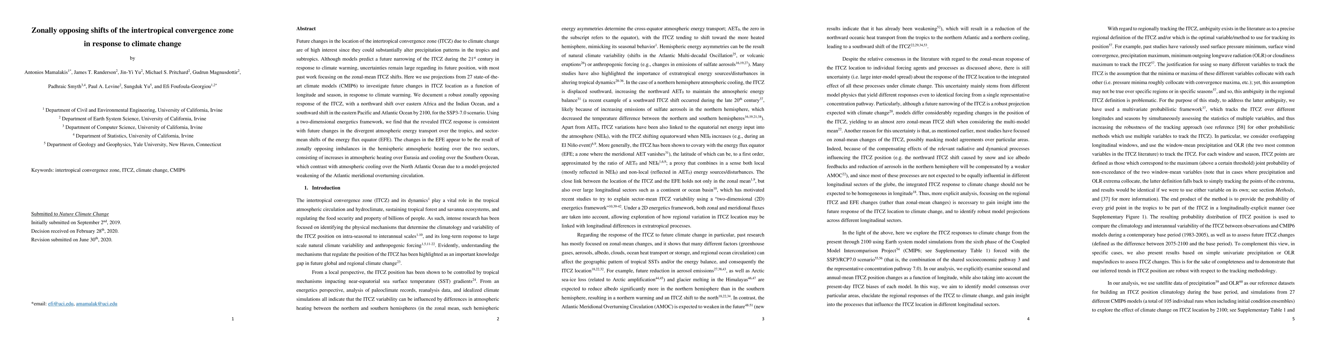 Future changes in the location of the intertropical convergence zone (ITCZ) due to climate change are of high interest since they could substantially alter precipitation patterns in the tropics and subtropics. Although models predict a future narrowing of the ITCZ during the 21st century in response to climate warming, uncertainties remain large regarding its future position, with most past work focusing on the zonal-mean ITCZ shifts. Here we use projections from 27 state-of-the-art climate models (CMIP6) to investigate future changes in ITCZ location as a function of longitude and season, in response to climate warming. We document a robust zonally opposing response of the ITCZ, with a northward shift over eastern Africa and the Indian Ocean, and a southward shift in the eastern Pacific and Atlantic Ocean by 2100, for the SSP3-7.0 scenario. Using a two-dimensional energetics framework, we find that the revealed ITCZ response is consistent with future changes in the divergent atmospheric energy transport over the tropics, and sector-mean shifts of the energy flux equator (EFE). The changes in the EFE appear to be the result of zonally opposing imbalances in the hemispheric atmospheric heating over the two sectors, consisting of increases in atmospheric heating over Eurasia and cooling over the Southern Ocean, which contrast with atmospheric cooling over the North Atlantic Ocean due to a model-projected weakening of the Atlantic meridional overturning circulation.