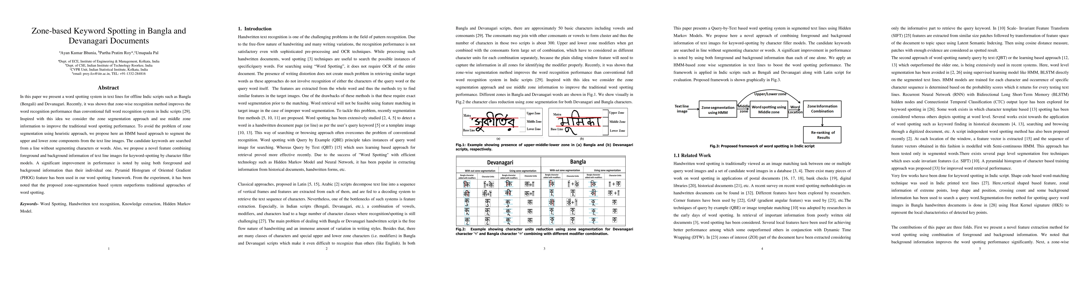 This paper introduces a zone-based keyword spotting system for Bangla and Devanagari scripts, using HMM for zone segmentation and combining foreground and background PHOG features for improved recognition performance over traditional methods.