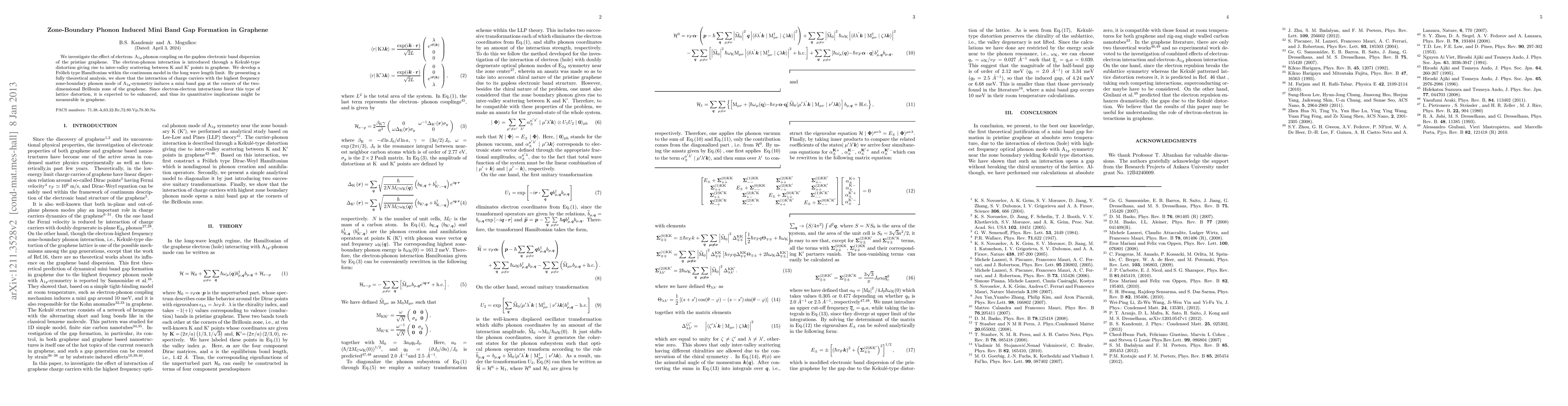 We investigate the effect of electron- $\mathrm{A}_{1g}$ phonon coupling on the gapless electronic band dispersion of the pristine graphene. The electron-phonon interaction is introduced through a Kekul\'{e}-type distortion giving rise to inter-valley scattering between K and K' points in graphene. We develop a Fr\"ohlich type Hamiltonian within the continuum model in the long wave length limit. By presenting a fully theoretical analysis, we show that the interaction of charge carriers with the highest frequency zone-boundary phonon mode of $% \mathrm{A}_{1g}$-symmetry induces a mini band gap at the corners of the two-dimensional Brillouin zone of the graphene. Since electron-electron interactions favor this type of lattice distortion, it is expected to be enhanced, and thus its quantitative implications might be measurable in graphene.