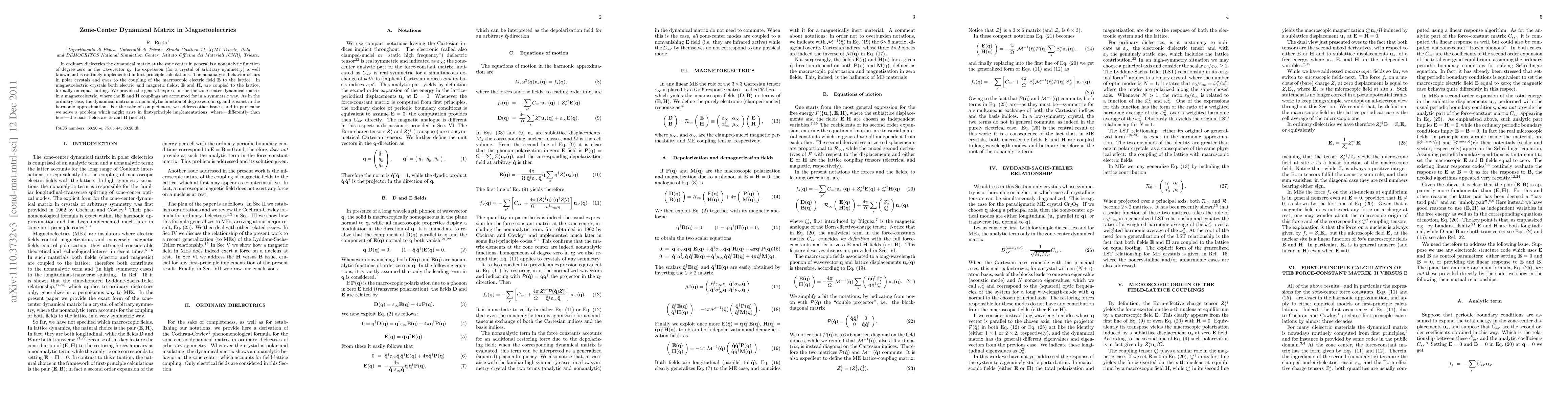 In ordinary dielectrics the dynamical matrix at the zone center in general is a nonanalytic function of degree zero in the wavevector q. Its expression (for a crystal of arbitrary symmetry) is well known and is routinely implemented in first principle calculations. The nonanalytic behavior occurs in polar crystals and owes to the coupling of the macroscopic electric field E to the lattice. In magnetoelectric crystals both electric and magnetic fields, E and H, are coupled to the lattice, formally on equal footing. We provide the general expression for the zone center dynamical matrix in a magnetoelectric, where the E and H couplings are accounted for in a symmetric way. As in the ordinary case, the dynamical matrix is a nonanalytic function of degree zero in q, and is exact in the harmonic approximation. For the sake of completeness, we address other issues, and in particular we solve a problem which might arise in first-principle implementations, where-differently than here-the basic fields are E and B (not H).