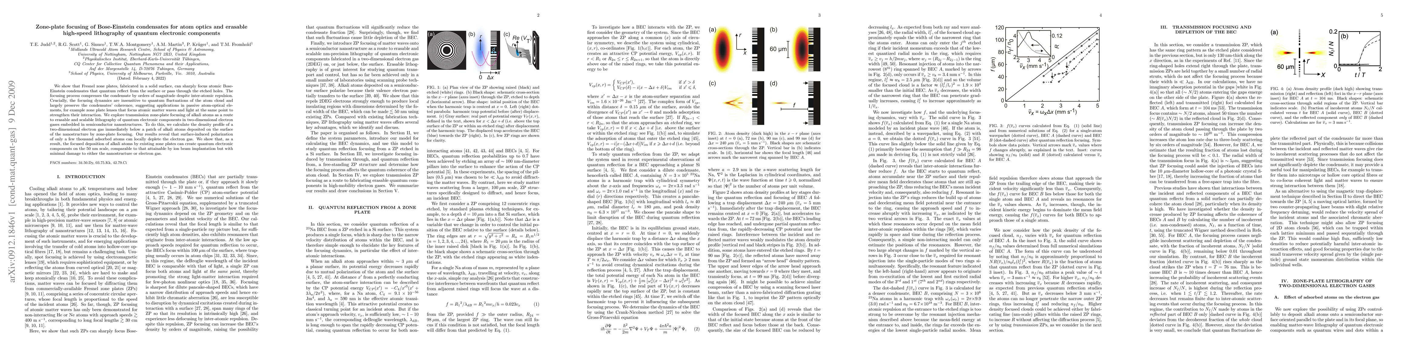 This paper demonstrates the use of Fresnel zone plates to sharply focus Bose-Einstein condensates, preserving coherence despite inter-atomic repulsion, and explores their application in atom optics and erasable high-speed lithography for quantum electronic components. The study shows that focused alkali atoms can locally deplete a two-dimensional electron gas, enabling scalable lithography on semiconductor nanostructures with minimal damage.