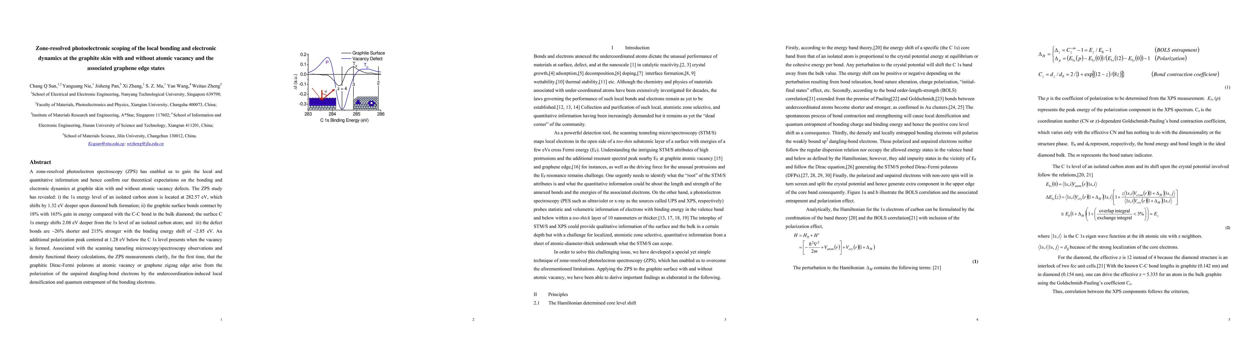 A zone-resolved photoelectron spectroscopy (ZPS) has enabled us to gain the local and quantitative information and hence confirm our theoretical expectations on the bonding and electronic dynamics at graphite skin with and without atomic vacancy defects. The ZPS study has revealed: i) the 1s energy level of an isolated carbon atom is located at 282.57 eV, which shifts by 1.32 eV deeper upon diamond bulk formation; ii) the graphite surface bonds contract by 18% with 165% gain in energy compared with the C-C bond in the bulk diamond; the surface C 1s energy shifts 2.08 eV deeper from the 1s level of an isolated carbon atom; and iii) the defect bonds are ~26% shorter and 215% stronger with the binding energy shift of ~2.85 eV. An additional polarization peak centered at 1.28 eV below the C 1s level presents when the vacancy is formed. Associated with the scanning tunneling microscopy/spectroscopy observations and density functional theory calculations, the ZPS measurements clarify, for the first time, that the graphitic Dirac-Fermi polarons at atomic vacancy or graphene zigzag edge arise from the polarization of the unpaired dangling-bond electrons by the undercoordination-induced local densification and quantum entrapment of the bonding electrons.