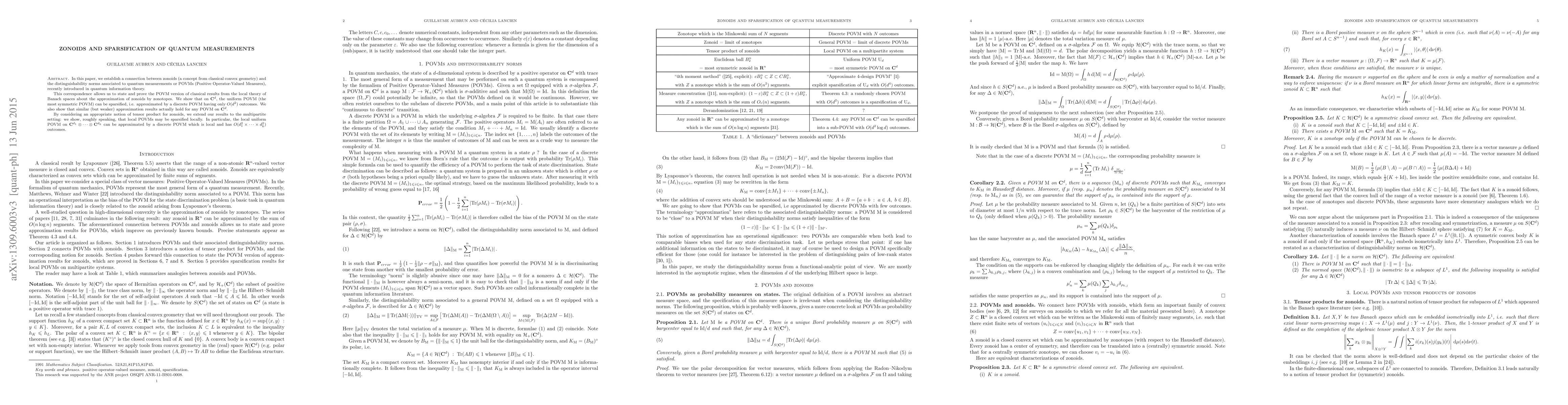 In this paper, we establish a connection between zonoids (a concept from classical convex geometry) and the distinguishability norms associated to quantum measurements, or POVMs (Positive Operator-Valued Measures), recently introduced in quantum information theory. This correspondence allows us to state and prove the POVM version of classical results from the local theory of Banach spaces about the approximation of zonoids by zonotopes. We show that on $\mathbf{C}^d$, the uniform POVM (the most symmetric POVM) can be sparsified, i.e. approximated by a discrete POVM, the latter having only $O(d^2)$ outcomes. We also show that similar (but weaker) approximation results actually hold for any POVM on $\mathbf{C}^d$. By defining an appropriate notion of tensor product for zonoids, we are then able to extend our results to the multipartite setting: we show, roughly speaking, that local POVMs may be sparsified locally. In particular, the local uniform POVM on $\mathbf{C}^{d_1}\otimes\cdots\otimes\mathbf{C}^{d_k}$ can be approximated by a discrete POVM which is local and has $O(d_1^2\times\cdots\times d_k^2)$ outcomes.