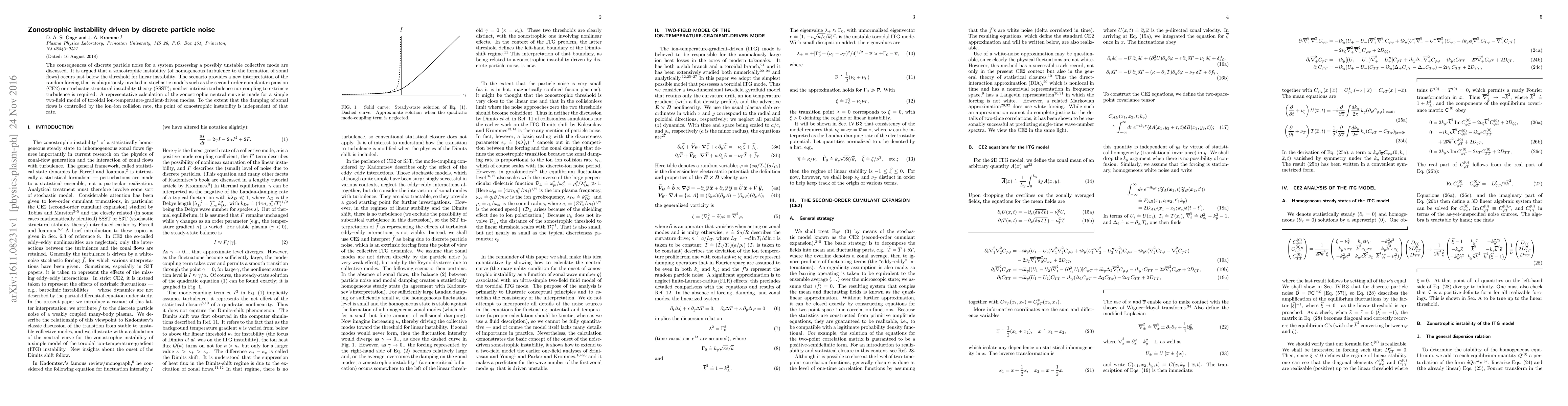 The consequences of discrete particle noise for a system possessing a possibly unstable collective mode are discussed. It is argued that a zonostrophic instability (of homogeneous turbulence to the formation of zonal flows) occurs just below the threshold for linear instability. The scenario provides a new interpretation of the random forcing that is ubiquitously invoked in stochastic models such as the second-order cumulant expansion (CE2) or stochastic structural instability theory (SSST); neither intrinsic turbulence nor coupling to extrinsic turbulence is required. A representative calculation of the zonostrophic neutral curve is made for a simple two-field model of toroidal ion-temperature-gradient-driven modes. To the extent that the damping of zonal flows is controlled by the ion--ion collision rate, the point of zonostrophic instability is independent of that rate.