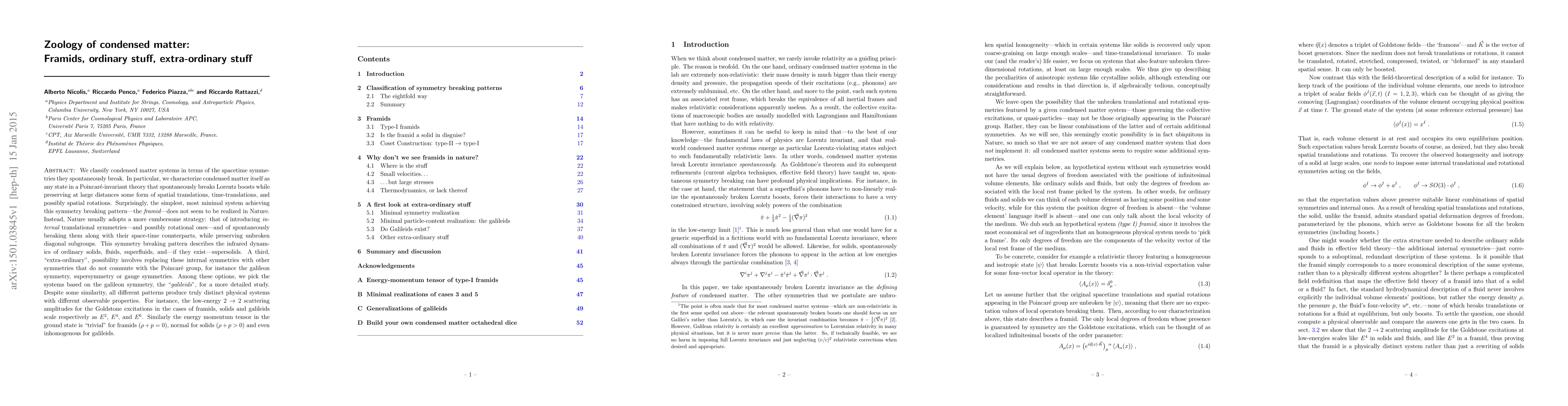 We classify condensed matter systems in terms of the spacetime symmetries they spontaneously break. In particular, we characterize condensed matter itself as any state in a Poincar\'e-invariant theory that spontaneously breaks Lorentz boosts while preserving at large distances some form of spatial translations, time-translations, and possibly spatial rotations. Surprisingly, the simplest, most minimal system achieving this symmetry breaking pattern---the "framid"---does not seem to be realized in Nature. Instead, Nature usually adopts a more cumbersome strategy: that of introducing internal translational symmetries---and possibly rotational ones---and of spontaneously breaking them along with their space-time counterparts, while preserving unbroken diagonal subgroups. This symmetry breaking pattern describes the infrared dynamics of ordinary solids, fluids, superfluids, and---if they exist---supersolids. A third, "extra-ordinary", possibility involves replacing these internal symmetries with other symmetries that do not commute with the Poincar\'e group, for instance the galileon symmetry, supersymmetry or gauge symmetries. Among these options, we pick the systems based on the galileon symmetry, the "galileids", for a more detailed study. Despite some similarity, all different patterns produce truly distinct physical systems with different observable properties. For instance, the low-energy $2\to 2$ scattering amplitudes for the Goldstone excitations in the cases of framids, solids and galileids scale respectively as $E^2$, $E^4$, and $E^6$. Similarly the energy momentum tensor in the ground state is "trivial" for framids ($\rho +p=0$), normal for solids ($\rho+p>0$) and even inhomogenous for galileids.