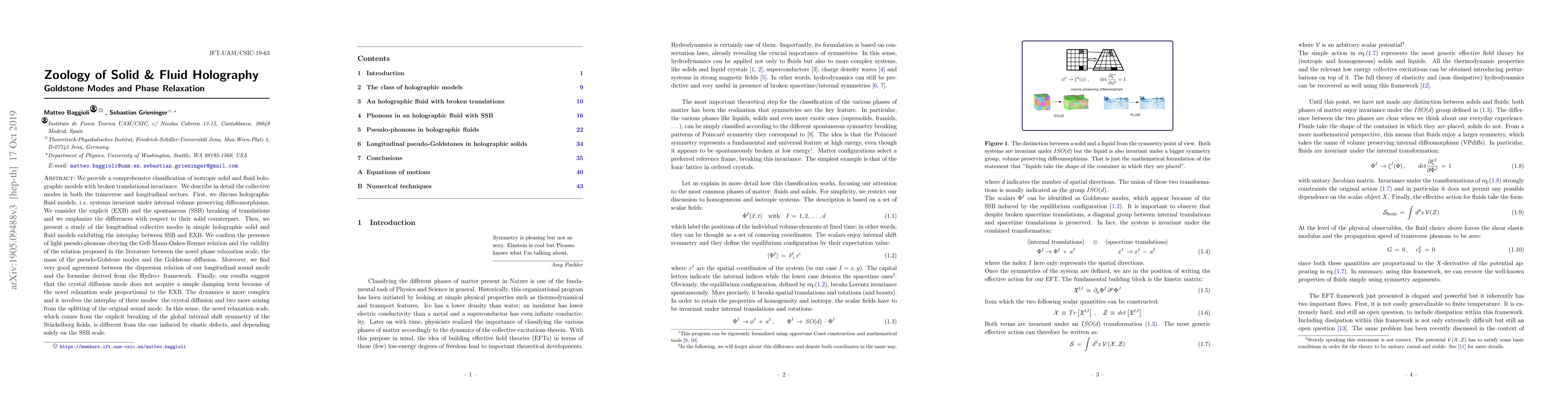 Researchers classify solid and fluid holographic models with broken translational invariance, finding light pseudo-phonons obeying the Gell-Mann-Oakes-Renner relation and a novel relaxation scale depending on explicit breaking of symmetry.