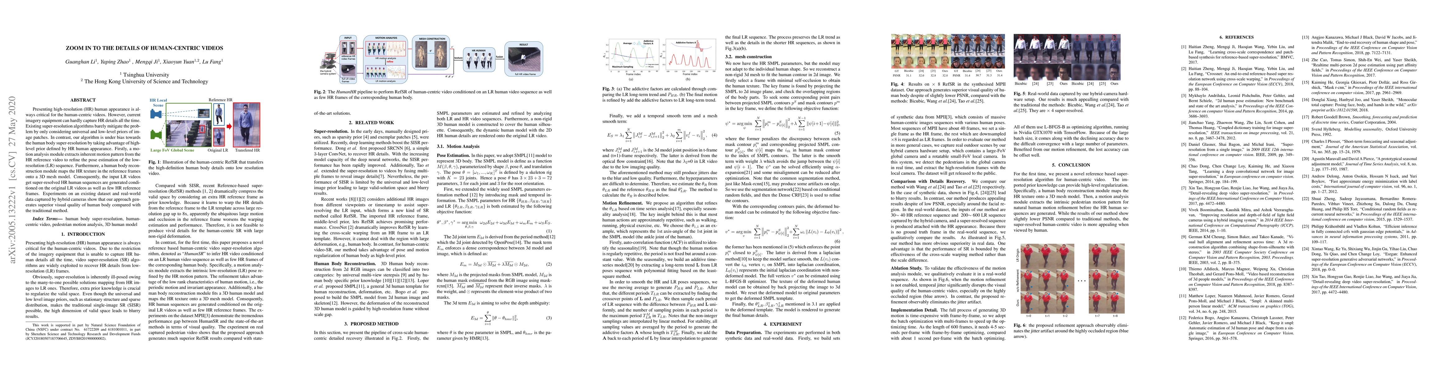 Presenting high-resolution (HR) human appearance is always critical for the human-centric videos. However, current imagery equipment can hardly capture HR details all the time. Existing super-resolution algorithms barely mitigate the problem by only considering universal and low-level priors of im-age patches. In contrast, our algorithm is under bias towards the human body super-resolution by taking advantage of high-level prior defined by HR human appearance. Firstly, a motion analysis module extracts inherent motion pattern from the HR reference video to refine the pose estimation of the low-resolution (LR) sequence. Furthermore, a human body reconstruction module maps the HR texture in the reference frames onto a 3D mesh model. Consequently, the input LR videos get super-resolved HR human sequences are generated conditioned on the original LR videos as well as few HR reference frames. Experiments on an existing dataset and real-world data captured by hybrid cameras show that our approach generates superior visual quality of human body compared with the traditional method.