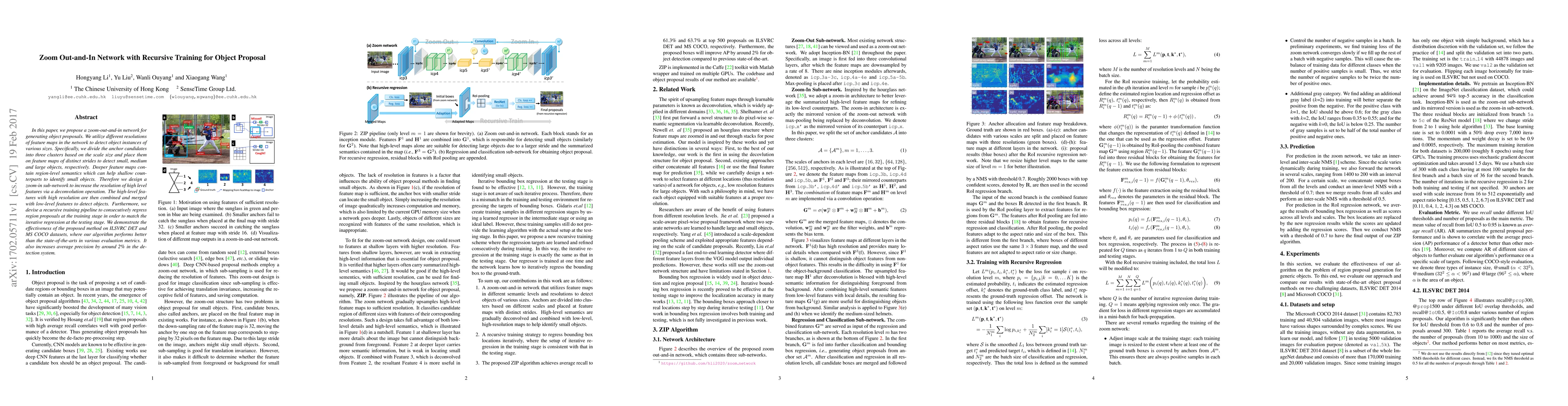 In this paper, we propose a zoom-out-and-in network for generating object proposals. We utilize different resolutions of feature maps in the network to detect object instances of various sizes. Specifically, we divide the anchor candidates into three clusters based on the scale size and place them on feature maps of distinct strides to detect small, medium and large objects, respectively. Deeper feature maps contain region-level semantics which can help shallow counterparts to identify small objects. Therefore we design a zoom-in sub-network to increase the resolution of high level features via a deconvolution operation. The high-level features with high resolution are then combined and merged with low-level features to detect objects. Furthermore, we devise a recursive training pipeline to consecutively regress region proposals at the training stage in order to match the iterative regression at the testing stage. We demonstrate the effectiveness of the proposed method on ILSVRC DET and MS COCO datasets, where our algorithm performs better than the state-of-the-arts in various evaluation metrics. It also increases average precision by around 2% in the detection system.