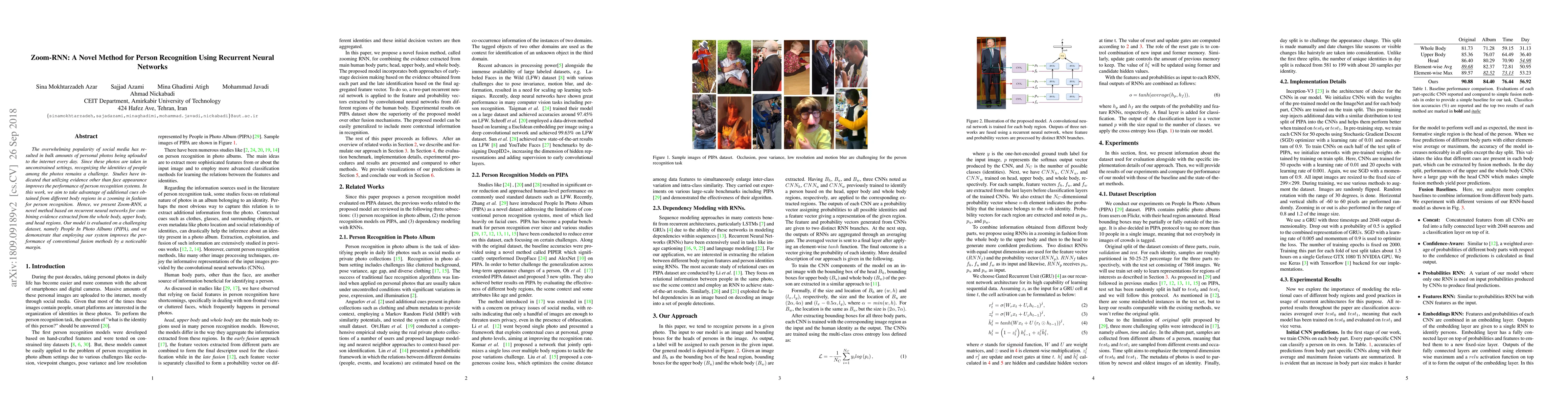 The overwhelming popularity of social media has resulted in bulk amounts of personal photos being uploaded to the internet every day. Since these photos are taken in unconstrained settings, recognizing the identities of people among the photos remains a challenge. Studies have indicated that utilizing evidence other than face appearance improves the performance of person recognition systems. In this work, we aim to take advantage of additional cues obtained from different body regions in a zooming in fashion for person recognition. Hence, we present Zoom-RNN, a novel method based on recurrent neural networks for combining evidence extracted from the whole body, upper body, and head regions. Our model is evaluated on a challenging dataset, namely People In Photo Albums (PIPA), and we demonstrate that employing our system improves the performance of conventional fusion methods by a noticeable margin.
