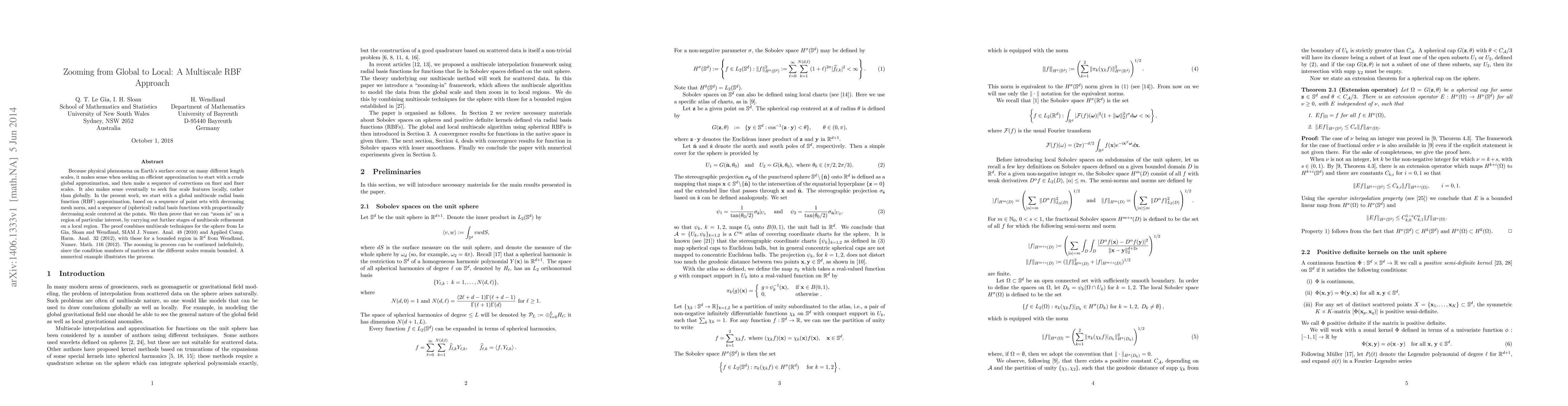 Because physical phenomena on Earth's surface occur on many different length scales, it makes sense when seeking an efficient approximation to start with a crude global approximation, and then make a sequence of corrections on finer and finer scales. It also makes sense eventually to seek fine scale features locally, rather than globally. In the present work, we start with a global multiscale radial basis function (RBF) approximation, based on a sequence of point sets with decreasing mesh norm, and a sequence of (spherical) radial basis functions with proportionally decreasing scale centered at the points. We then prove that we can "zoom in" on a region of particular interest, by carrying out further stages of multiscale refinement on a local region. The proof combines multiscale techniques for the sphere from Le Gia, Sloan and Wendland, SIAM J. Numer. Anal. 48 (2010) and Applied Comp. Harm. Anal. 32 (2012), with those for a bounded region in $\mathbb{R}^d$ from Wendland, Numer. Math. 116 (2012). The zooming in process can be continued indefinitely, since the condition numbers of matrices at the different scales remain bounded. A numerical example illustrates the process.