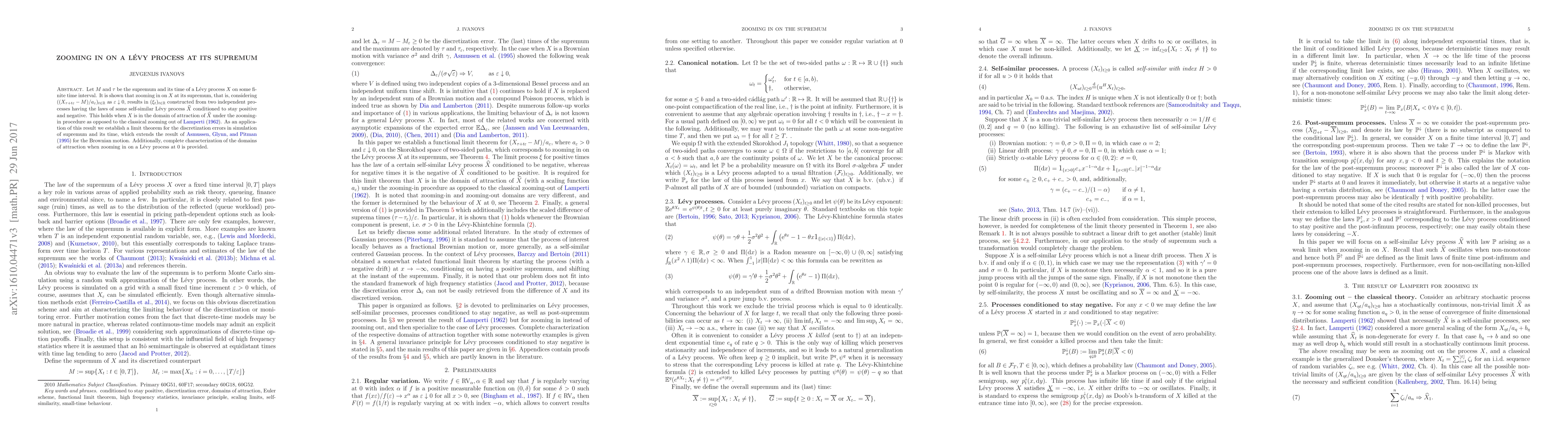 Let $M$ and $\tau$ be the supremum and its time of a L\'evy process $X$ on some finite time interval. It is shown that zooming in on $X$ at its supremum, that is, considering $((X_{\tau+t\varepsilon}-M)/a_\varepsilon)_{t\in\mathbb R}$ as $\varepsilon\downarrow 0$, results in $(\xi_t)_{t\in\mathbb R}$ constructed from two independent processes having the laws of some self-similar L\'evy process $\widehat X$ conditioned to stay positive and negative. This holds when $X$ is in the domain of attraction of $\widehat X$ under the zooming-in procedure as opposed to the classical zooming out of Lamperti (1962). As an application of this result we establish a limit theorem for the discretization errors in simulation of supremum and its time, which extends the result of Asmussen, Glynn and Pitman (1995) for the Brownian motion. Additionally, complete characterization of the domains of attraction when zooming in on a L\'evy process at 0 is provided.
