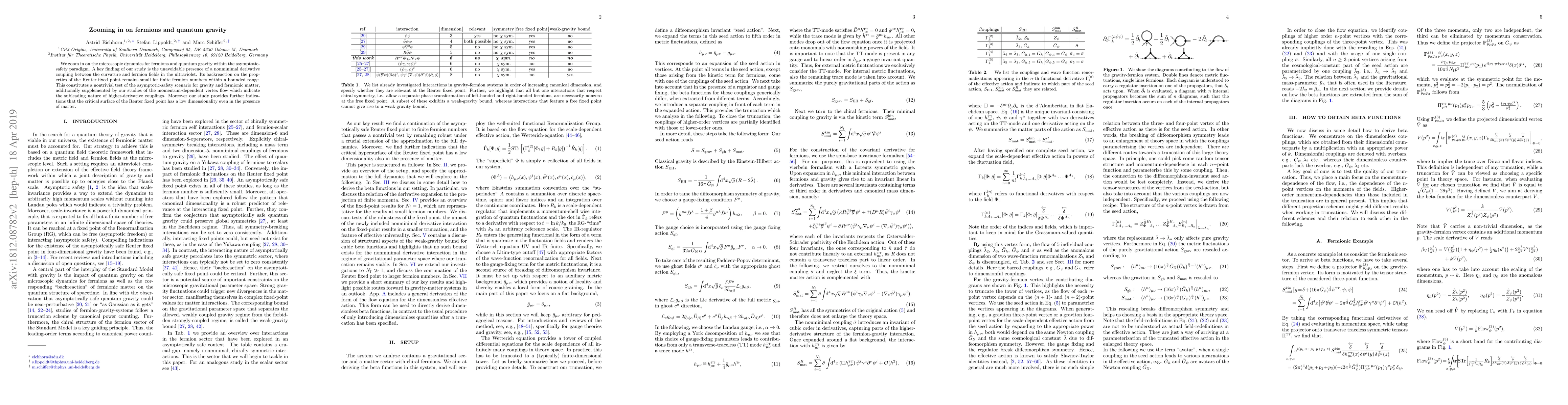 We zoom in on the microscopic dynamics for fermions and quantum gravity within the asymptotic-safety paradigm. A key finding of our study is the unavoidable presence of a nonminimal derivative coupling between the curvature and fermion fields in the ultraviolet. Its backreaction on the properties of the Reuter fixed point remains small for finite fermion numbers within a bounded range. This constitutes a nontrivial test of the asymptotic-safety scenario for gravity and fermionic matter, additionally supplemented by our studies of the momentum-dependent vertex flow which indicate the subleading nature of higher-derivative couplings. Moreover our study provides further indications that the critical surface of the Reuter fixed point has a low dimensionality even in the presence of matter.