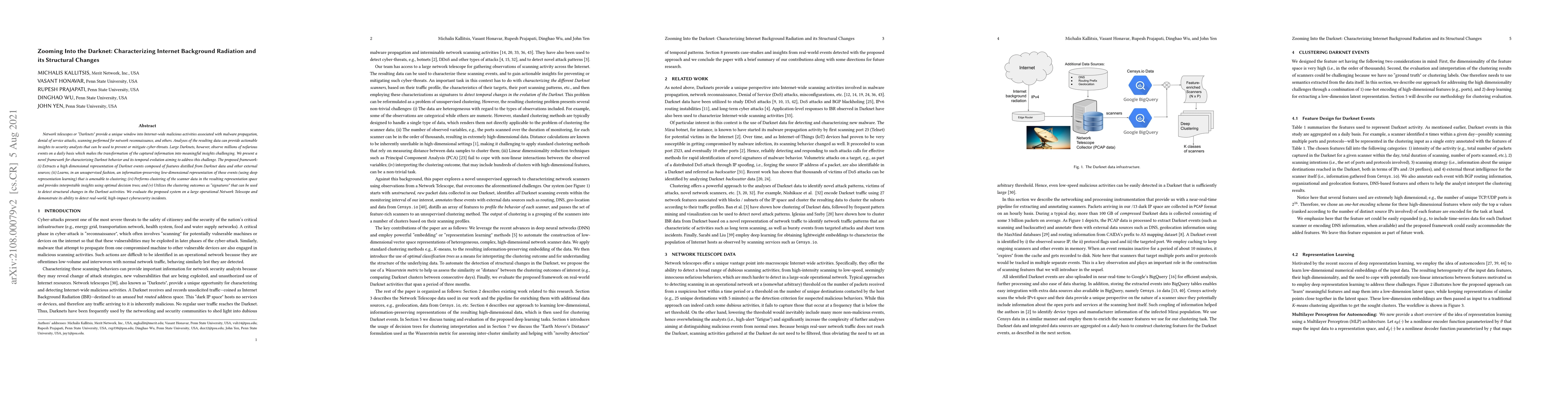 This paper introduces a novel framework for analyzing and characterizing the behavior of Darknets, which monitor Internet-wide malicious activities. The framework extracts high-dimensional representations of Darknet events, uses deep learning to create low-dimensional representations for clustering, and detects structural changes in malicious activities, providing actionable insights for cybersecurity.