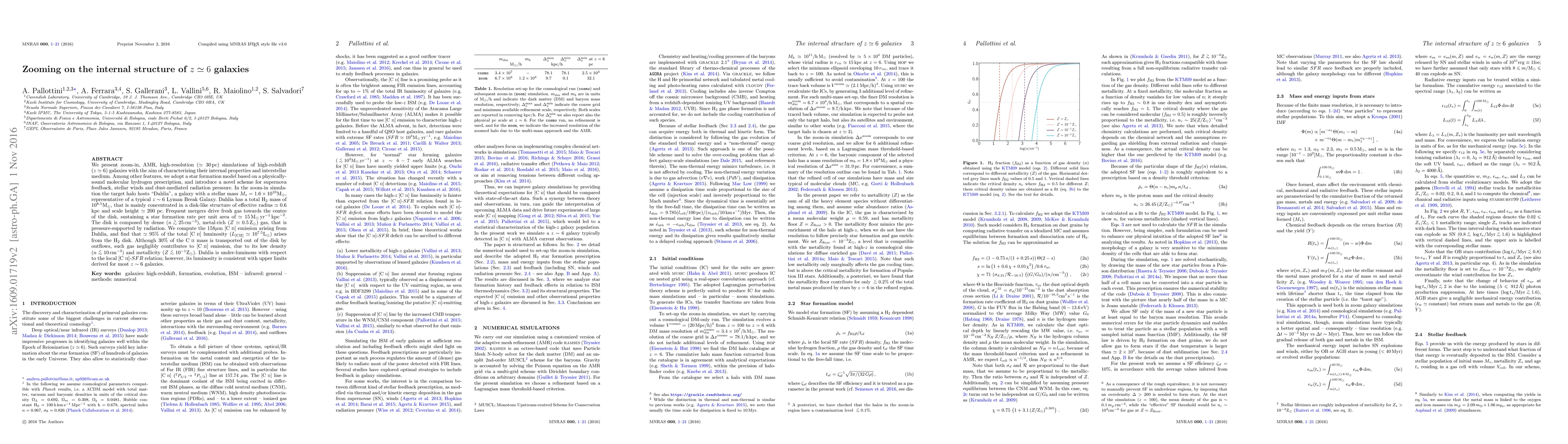 We present zoom-in, AMR, high-resolution ($\simeq 30$ pc) simulations of high-redshift ($z \simeq 6$) galaxies with the aim of characterizing their internal properties and interstellar medium. Among other features, we adopt a star formation model based on a physically-sound molecular hydrogen prescription, and introduce a novel scheme for supernova feedback, stellar winds and dust-mediated radiation pressure. In the zoom-in simulation the target halo hosts "Dahlia", a galaxy with a stellar mass $M_*=1.6\times 10^{10}$M$_\odot$, representative of a typical $z\sim 6$ Lyman Break Galaxy. Dahlia has a total H2 mass of $10^{8.5}$M$_\odot$, that is mainly concentrated in a disk-like structure of effective radius $\simeq 0.6$ kpc and scale height $\simeq 200$ pc. Frequent mergers drive fresh gas towards the center of the disk, sustaining a star formation rate per unit area of $\simeq 15 $M$_\odot$ yr$^{-1}$ kpc$^{-2}$. The disk is composed by dense ($n \gtrsim 25$ cm$^{-3}$), metal-rich ($Z \simeq 0.5 $ Z$_\odot$) gas, that is pressure-supported by radiation. We compute the $158\mu$m [CII] emission arising from {Dahlia}, and find that $\simeq 95\%$ of the total [CII] luminosity ($L_{[CII]}\simeq10^{7.5}$ L$_\odot$) arises from the H2 disk. Although $30\%$ of the CII mass is transported out of the disk by outflows, such gas negligibly contributes to [CII] emission, due to its low density ($n \lesssim 10$ cm$^{-3}$) and metallicity ($Z\lesssim 10^{-1}$Z$_\odot$). Dahlia is under-luminous with respect to the local [CII]-SFR relation; however, its luminosity is consistent with upper limits derived for most $z\sim6$ galaxies.