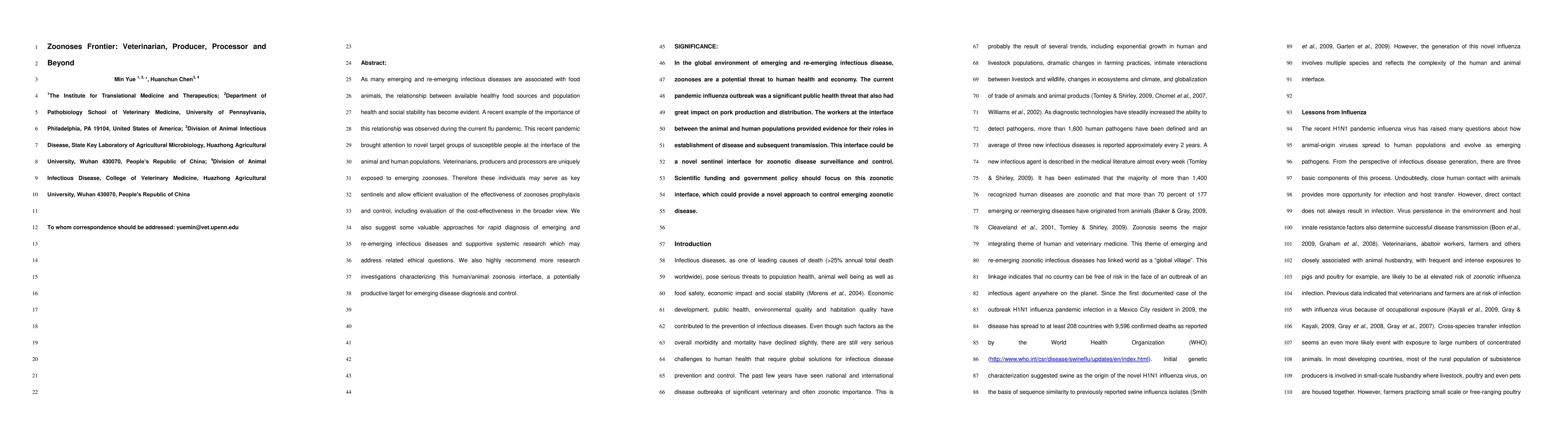 As many emerging and re-emerging infectious diseases are associated with food animals, the relationship between available healthy food sources and population health and social stability has become evident. A recent example of the importance of this relationship was observed during the current flu pandemic. This recent pandemic brought attention to novel target groups of susceptible people at the interface of the animal and human populations. Veterinarians, producers and processors are uniquely exposed to emerging zoonoses. Therefore these individuals may serve as key sentinels and allow efficient evaluation of the effectiveness of zoonoses prophylaxis and control, including evaluation of the cost-effectiveness in the broader view. We also suggest some valuable approaches for rapid diagnosis of emerging and re-emerging infectious diseases and supportive systemic research which may address related ethical questions. We also highly recommend more research investigations characterizing this human/animal zoonosis interface, a potentially productive target for emerging disease diagnosis and control.