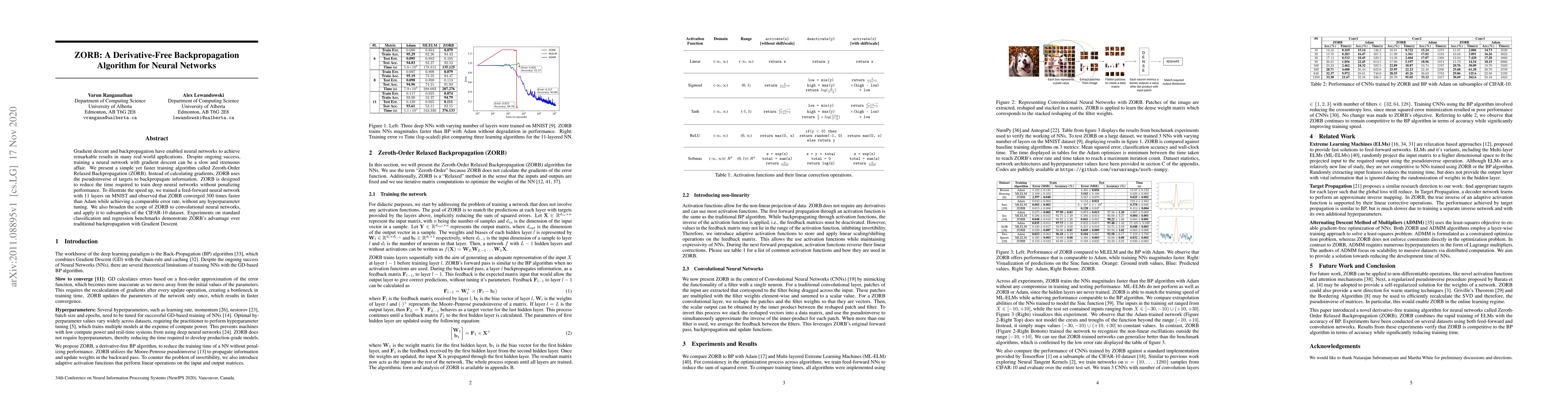The paper introduces ZORB, a derivative-free backpropagation algorithm that significantly speeds up neural network training by using pseudoinverses instead of gradients, achieving faster convergence without sacrificing performance on datasets like MNIST and CIFAR-10. ZORB demonstrates comparable error rates to traditional methods while requiring less training time.