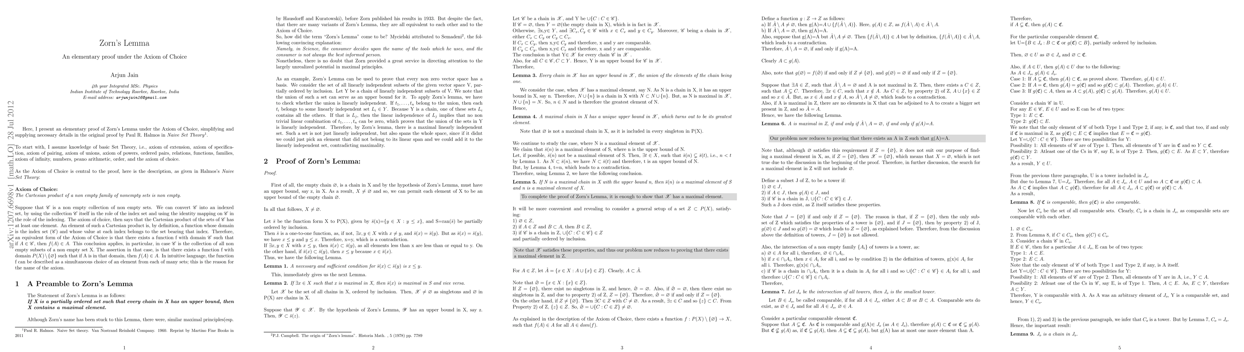 This paper provides a simplified, detailed proof of Zorn's Lemma based on the Axiom of Choice, expanding on Paul R. Halmos' original work. It also includes a historical introduction to Zorn's Lemma to contextualize its significance as a maximal principle.