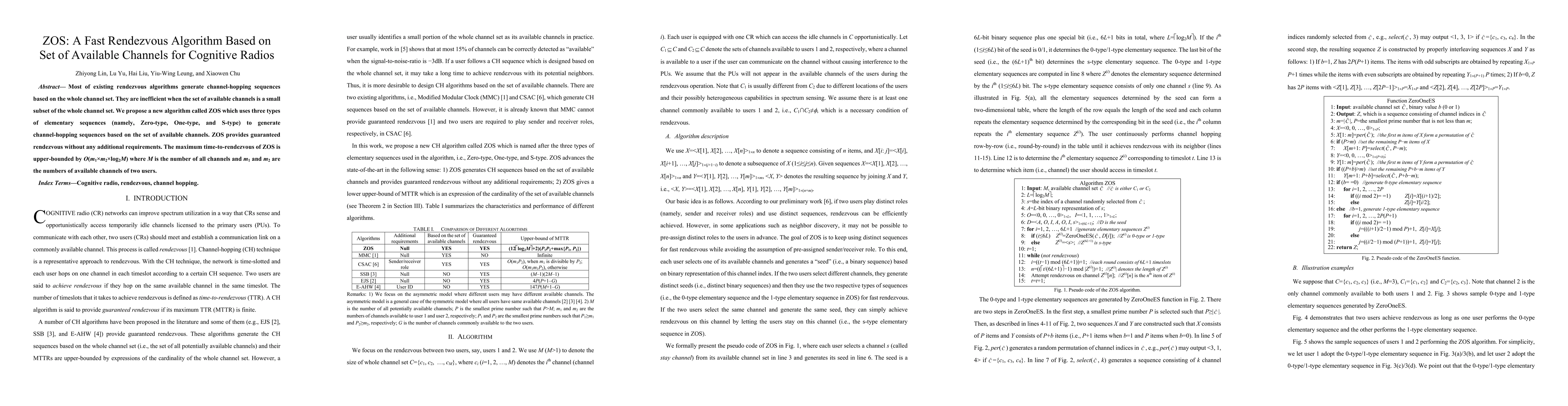 The ZOS algorithm proposes a fast rendezvous method for cognitive radios using only available channels, employing Zero-type, One-type, and S-type sequences for efficient channel-hopping. It guarantees rendezvous without additional requirements, with a time complexity upper-bounded by O(m1*m2*log2M).