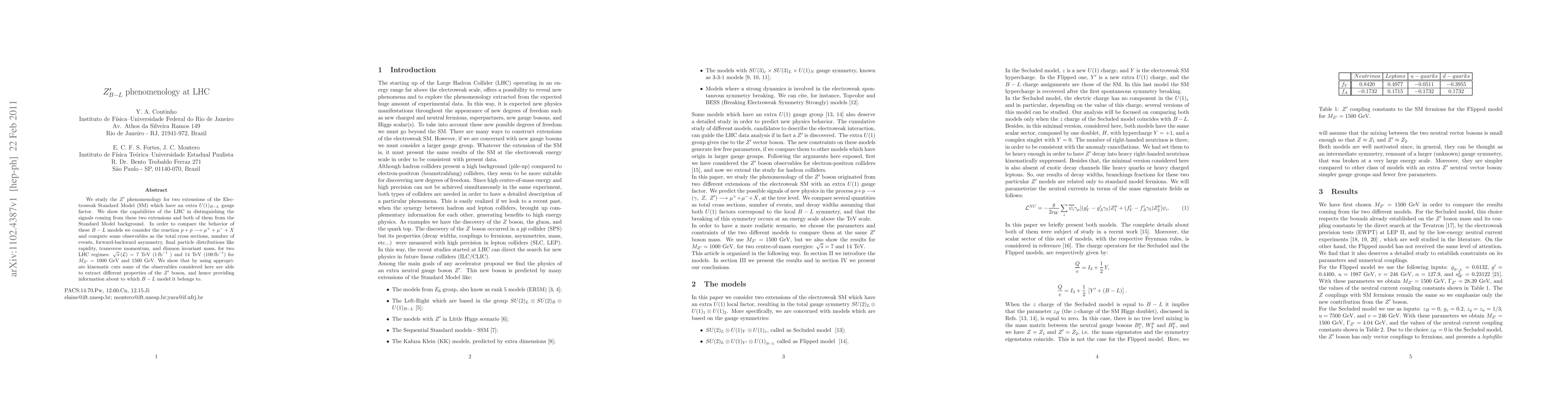 We study the $Z^\prime$ phenomenology for two extensions of the Electroweak Standard Model (SM) which have an extra $U(1)_{B-L}$ gauge factor. We show the capabilities of the LHC in distinguishing the signals coming from these two extensions and both of them from the Standard Model background. In order to compare the behavior of these $B-L$ models we consider the reaction $p + p\longrightarrow \mu^+ + \mu^- + X$ and compute some observables as the total cross sections, number of events, forward-backward asymmetry, final particle distributions like rapidity, transverse momentum, and dimuon invariant mass, for two LHC regimes: $\sqrt{s}\,({\cal L})=7$ TeV ($1\, \textrm{fb}^{-1}$) and $14 $ TeV ($100\, \textrm{fb}^{-1}$) for $M_{Z^{\prime}}$ = 1000 GeV and 1500 GeV. We show that by using appropriate kinematic cuts some of the observables considered here are able to extract different properties of the $Z^\prime$ boson, and hence providing information about to which $B-L$ model it belongs to.