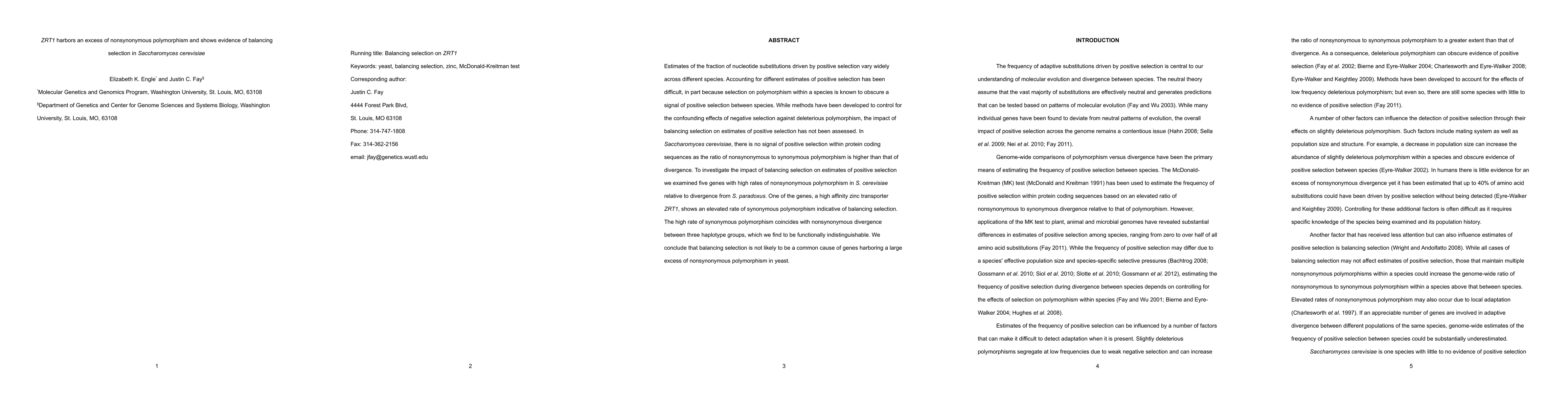 Estimates of the fraction of nucleotide substitutions driven by positive selection vary widely across different species. Accounting for different estimates of positive selection has been difficult, in part because selection on polymorphism within a species is known to obscure a signal of positive selection between species. While methods have been developed to control for the confounding effects of negative selection against deleterious polymorphism, the impact of balancing selection on estimates of positive selection has not been assessed. In Saccharomyces cerevisiae, there is no signal of positive selection within protein coding sequences as the ratio of nonsynonymous to synonymous polymorphism is higher than that of divergence. To investigate the impact of balancing selection on estimates of positive selection we examined five genes with high rates of nonsynonymous polymorphism in S. cerevisiae relative to divergence from S. paradoxus. One of the genes, a high affinity zinc transporter ZRT1, shows an elevated rate of synonymous polymorphism indicative of balancing selection. The high rate of synonymous polymorphism coincides with nonsynonymous divergence between three haplotype groups, which we find to be functionally indistinguishable. We conclude that balancing selection is not likely to be a common cause of genes harboring a large excess of nonsynonymous polymorphism in yeast.