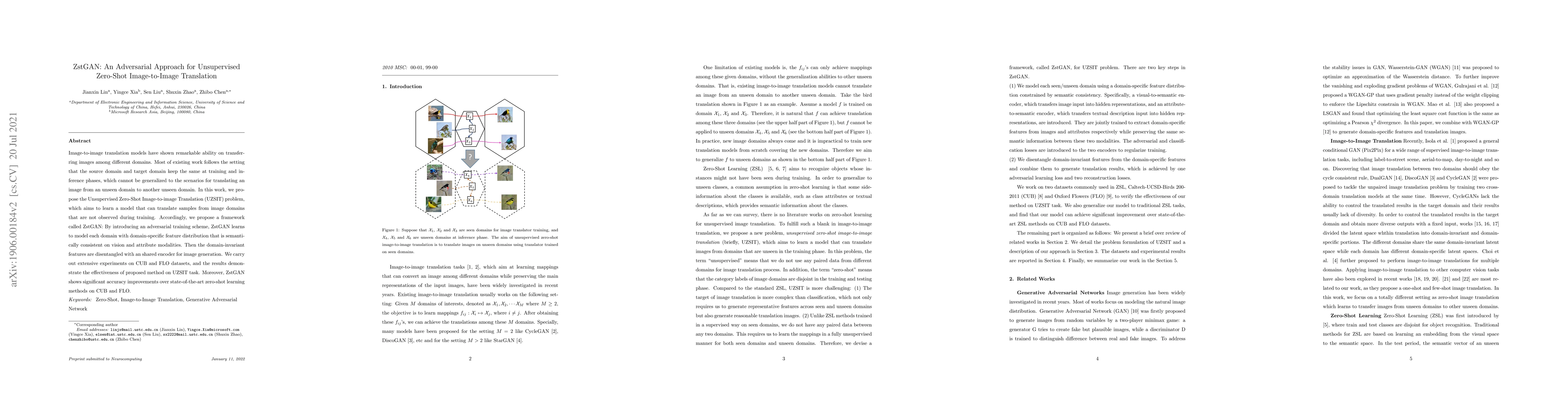 This paper proposes ZstGAN, an adversarial approach for unsupervised zero-shot image-to-image translation, which can translate images between unseen domains without prior knowledge of the target domain. The method demonstrates significant accuracy improvements over state-of-the-art methods on two benchmark datasets.