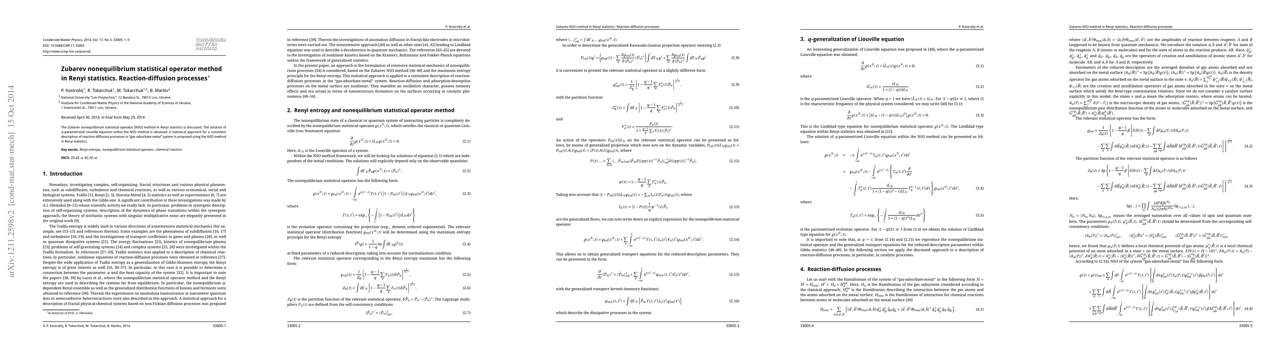 The Zubarev nonequilibrium statistical operator method in Renyi statistics is applied to solve the $q$-parametrized Liouville equation, providing a consistent statistical approach for reaction-diffusion processes in a "gas-adsorbate-metal" system. This method enhances the understanding of nonequilibrium dynamics in complex systems.