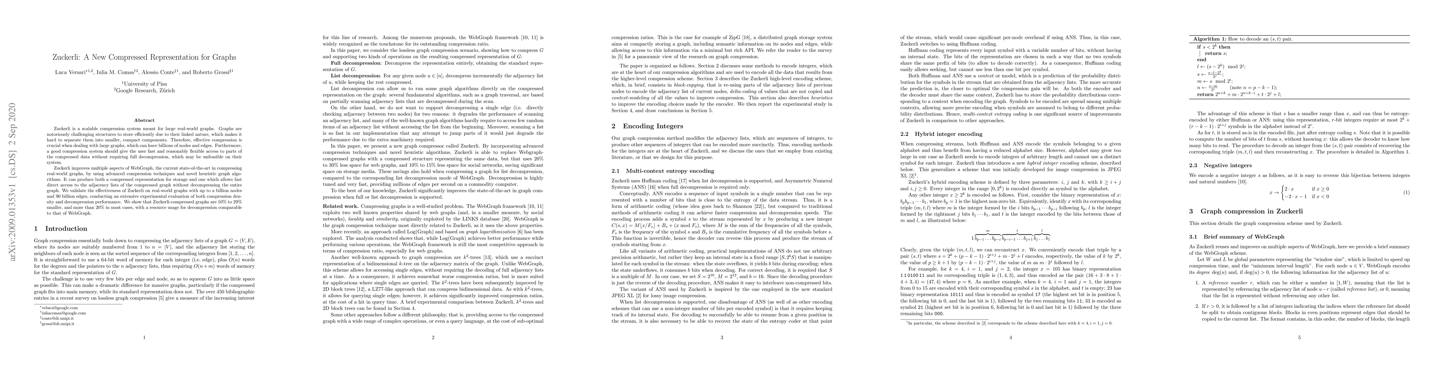 Zuckerli is a scalable compression system meant for large real-world graphs. Graphs are notoriously challenging structures to store efficiently due to their linked nature, which makes it hard to separate them into smaller, compact components. Therefore, effective compression is crucial when dealing with large graphs, which can have billions of nodes and edges. Furthermore, a good compression system should give the user fast and reasonably flexible access to parts of the compressed data without requiring full decompression, which may be unfeasible on their system. Zuckerli improves multiple aspects of WebGraph, the current state-of-the-art in compressing real-world graphs, by using advanced compression techniques and novel heuristic graph algorithms. It can produce both a compressed representation for storage and one which allows fast direct access to the adjacency lists of the compressed graph without decompressing the entire graph. We validate the effectiveness of Zuckerli on real-world graphs with up to a billion nodes and 90 billion edges, conducting an extensive experimental evaluation of both compression density and decompression performance. We show that Zuckerli-compressed graphs are 10% to 29% smaller, and more than 20% in most cases, with a resource usage for decompression comparable to that of WebGraph.