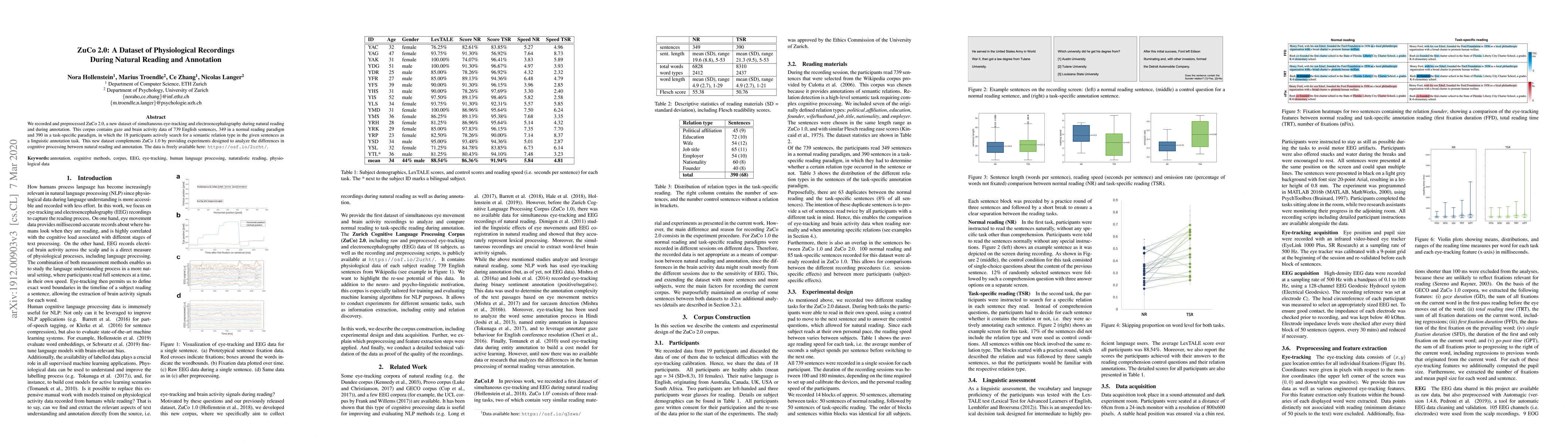ZuCo 2.0 is a dataset featuring simultaneous eye-tracking and EEG recordings during natural reading and annotation tasks. It provides cognitive processing data for 739 sentences, aiding in the analysis of differences between natural reading and active linguistic annotation.