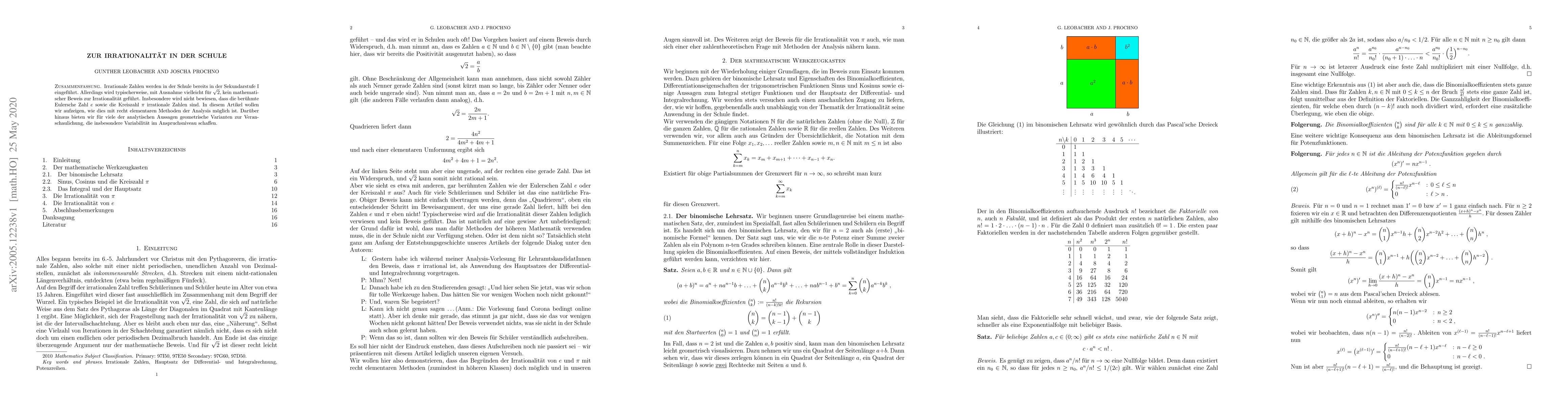 Irrational numbers are introduced usually already introduced in lower secondary level schools. But typically, maybe with the exception of $\sqrt{2}$, no mathematical proof of irrationality is provided. In particular it is not proven that famous Euler's number $e$ as well as the number $\pi$ are irrational. In this article we want to show how this can be done with very elementary methods from calculus. In addition, we offer geometrical variants for many of the analytical statements, which in particular create variability in the level of requirements. ----- Irrationale Zahlen werden in der Schule bereits in der Sekundarstufe I eingef\"uhrt. Allerdings wird typischerweise, mit Ausnahme vielleicht f\"ur $\sqrt{2}$, kein mathematischer Beweis zur Irrationalit\"at gef\"uhrt. Insbesondere wird nicht bewiesen, dass die ber\"uhmte Eulersche Zahl $e$ sowie die Kreiszahl $\pi$ irrationale Zahlen sind. In diesem Artikel wollen wir aufzeigen, wie dies mit recht elementaren Methoden der Analysis m\"oglich ist. Dar\"uber hinaus bieten wir f\"ur viele der analytischen Aussagen geometrische Varianten zur Veranschaulichung, die insbesondere Variabilit\"at im Anspruchsniveau schaffen.