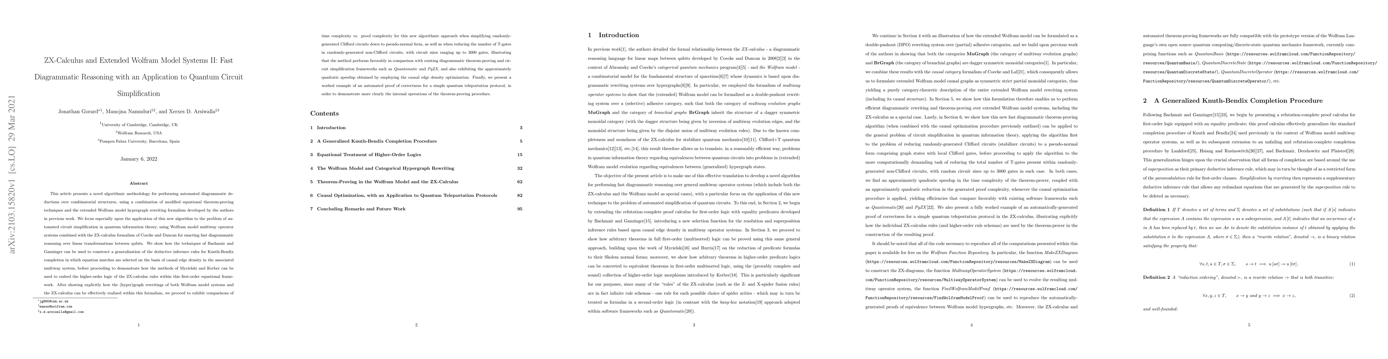 This article presents a novel algorithmic methodology for performing automated diagrammatic deductions over combinatorial structures, using a combination of modified equational theorem-proving techniques and the extended Wolfram model hypergraph rewriting formalism developed by the authors in previous work. We focus especially upon the application of this new algorithm to the problem of automated circuit simplification in quantum information theory, using Wolfram model multiway operator systems combined with the ZX-calculus formalism for enacting fast diagrammatic reasoning over linear transformations between qubits. We show how to construct a generalization of the deductive inference rules for Knuth-Bendix completion in which equation matches are selected on the basis of causal edge density in the associated multiway system, before proceeding to demonstrate how to embed the higher-order logic of the ZX-calculus rules within this first-order equational framework. After showing explicitly how the (hyper)graph rewritings of both Wolfram model systems and the ZX-calculus can be effectively realized within this formalism, we proceed to exhibit comparisons of time complexity vs. proof complexity for this new algorithmic approach when simplifying randomly-generated Clifford circuits down to pseudo-normal form, as well as when reducing the number of T-gates in randomly-generated non-Clifford circuits, with circuit sizes ranging up to 3000 gates, illustrating that the method performs favorably in comparison with existing circuit simplification frameworks, and also exhibiting the approximately quadratic speedup obtained by employing the causal edge density optimization. Finally, we present a worked example of an automated proof of correctness for a simple quantum teleportation protocol, in order to demonstrate more clearly the internal operations of the theorem-proving procedure.
