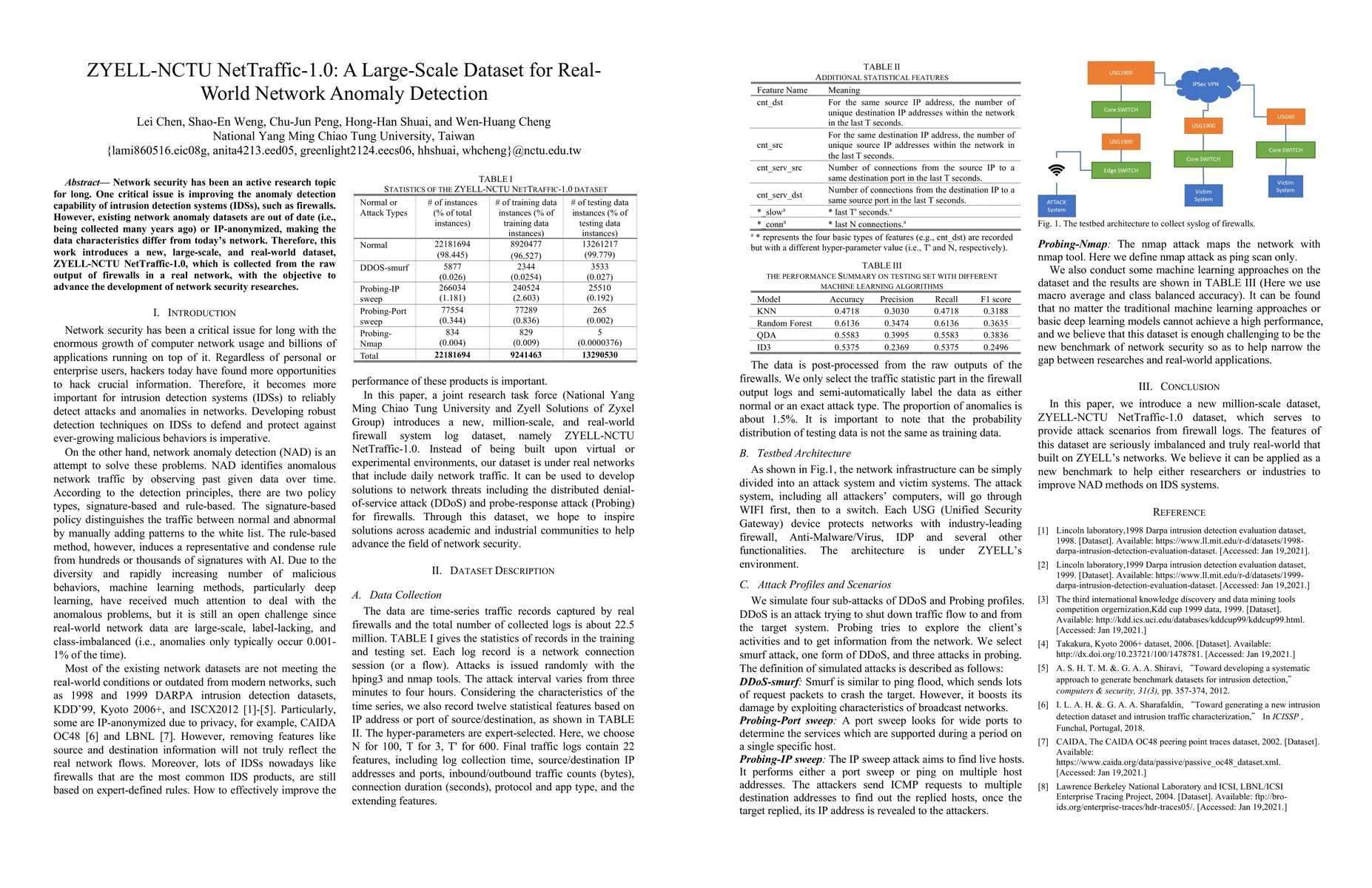 Summary: This paper introduces a new, large-scale dataset, ZYELL-NCTU NetTraffic-1.0, aimed at enhancing real-world network anomaly detection. The dataset, collected from firewall outputs, addresses the limitations of outdated and anonymized existing datasets.