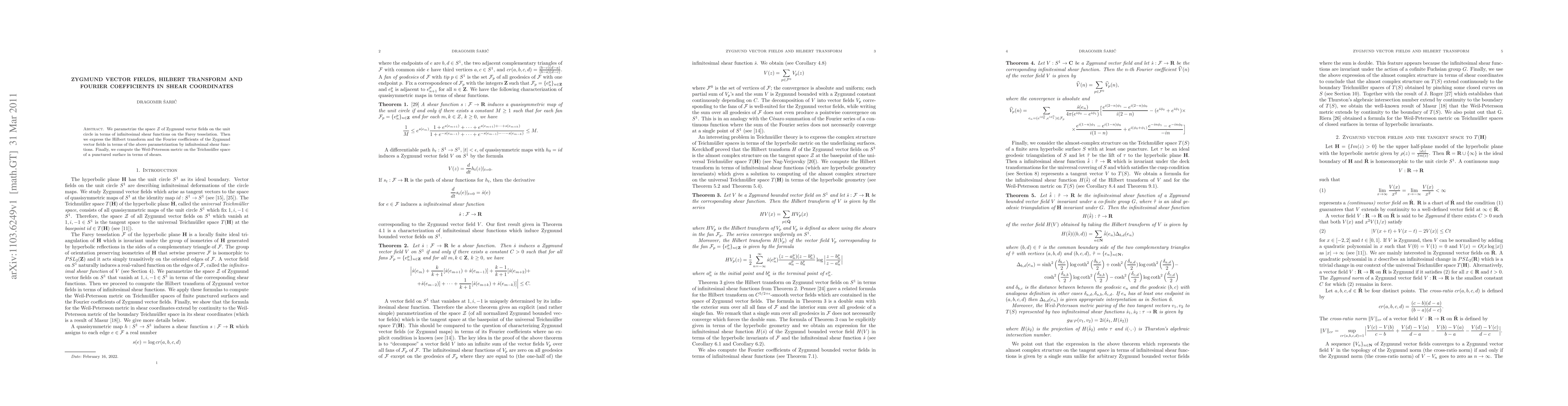 We parametrize the space $\mathcal{Z}$ of Zygmund vector fields on the unit circle in terms of infinitesimal shear functions on the Farey tesselation. Then we express the Hilbert transform and the Fourier coefficients of the Zygmund vector fields in terms of the above parametrization by infinitesimal shear functions. Finally, we compute the Weil-Petersson metric on the Teichm\"uller space of a punctured surface in terms of shears.
