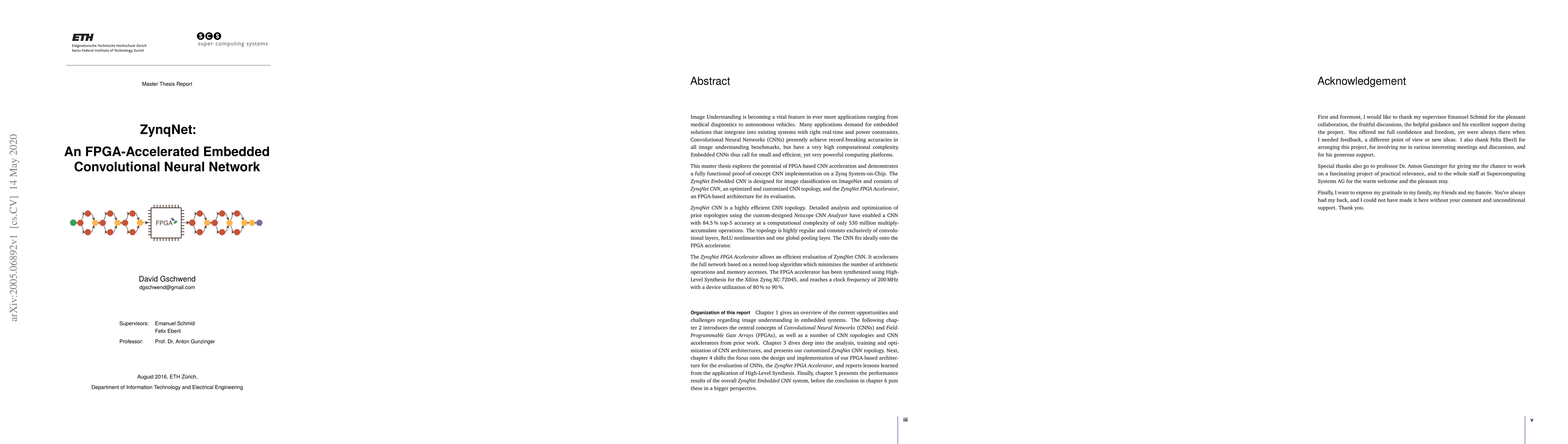 Image Understanding is becoming a vital feature in ever more applications ranging from medical diagnostics to autonomous vehicles. Many applications demand for embedded solutions that integrate into existing systems with tight real-time and power constraints. Convolutional Neural Networks (CNNs) presently achieve record-breaking accuracies in all image understanding benchmarks, but have a very high computational complexity. Embedded CNNs thus call for small and efficient, yet very powerful computing platforms. This master thesis explores the potential of FPGA-based CNN acceleration and demonstrates a fully functional proof-of-concept CNN implementation on a Zynq System-on-Chip. The ZynqNet Embedded CNN is designed for image classification on ImageNet and consists of ZynqNet CNN, an optimized and customized CNN topology, and the ZynqNet FPGA Accelerator, an FPGA-based architecture for its evaluation. ZynqNet CNN is a highly efficient CNN topology. Detailed analysis and optimization of prior topologies using the custom-designed Netscope CNN Analyzer have enabled a CNN with 84.5% top-5 accuracy at a computational complexity of only 530 million multiplyaccumulate operations. The topology is highly regular and consists exclusively of convolutional layers, ReLU nonlinearities and one global pooling layer. The CNN fits ideally onto the FPGA accelerator. The ZynqNet FPGA Accelerator allows an efficient evaluation of ZynqNet CNN. It accelerates the full network based on a nested-loop algorithm which minimizes the number of arithmetic operations and memory accesses. The FPGA accelerator has been synthesized using High-Level Synthesis for the Xilinx Zynq XC-7Z045, and reaches a clock frequency of 200MHz with a device utilization of 80% to 90 %.