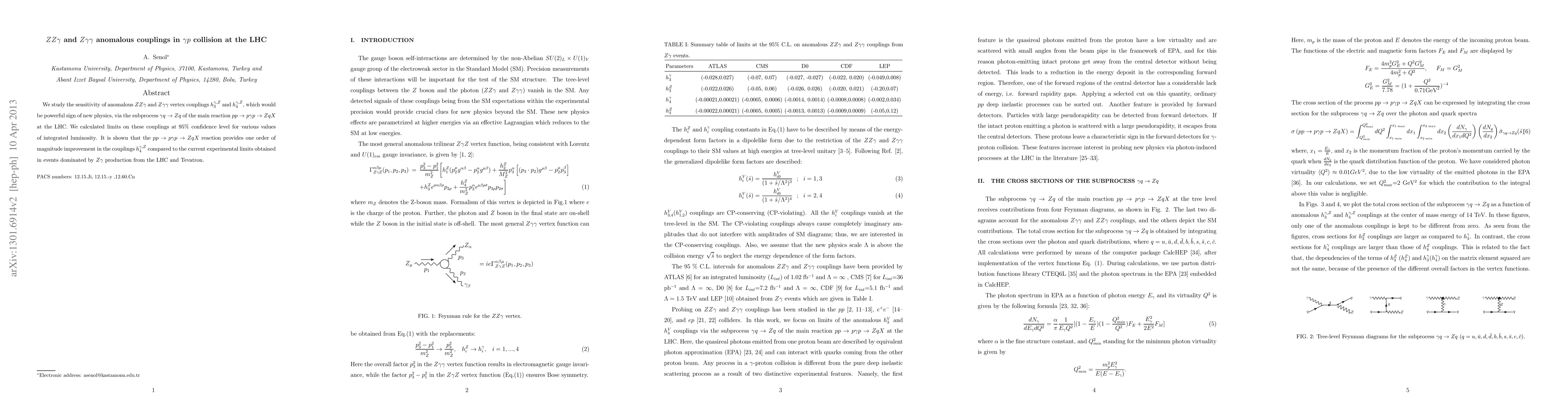 This paper investigates the sensitivity to anomalous $ZZ\gamma$ and $Z\gamma\gamma$ vertex couplings in $\gamma p$ collisions at the LHC, finding significant improvements in detecting $h_4^{\gamma,Z}$ couplings over current experimental limits. The study uses the $\gamma q\to Z q$ subprocess within the main reaction $pp\to p\gamma p\to Z q X$ to achieve these results.