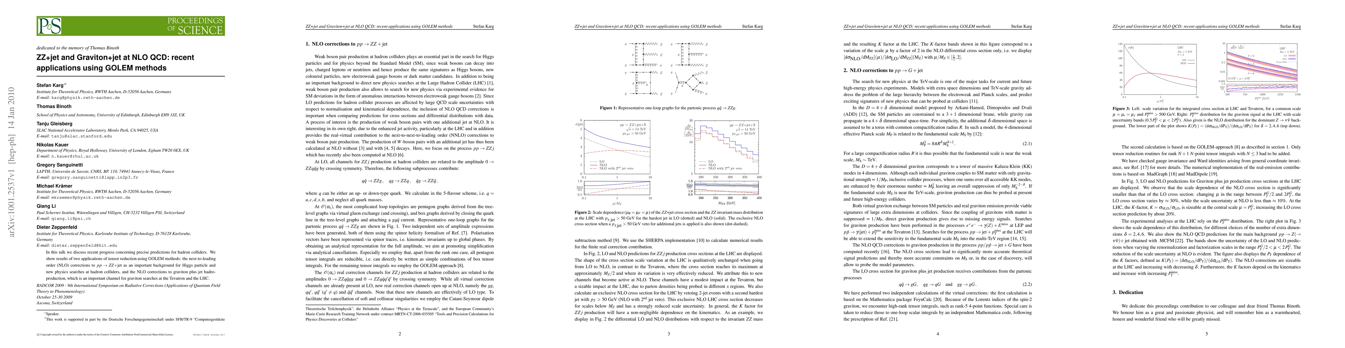 This paper discusses recent advancements in precise predictions for hadron colliders using GOLEM methods for tensor reduction, focusing on next-to-leading order (NLO) corrections for $pp \to ZZ+$jet and graviton+jet processes, crucial for Higgs and new physics searches, as well as graviton detection.