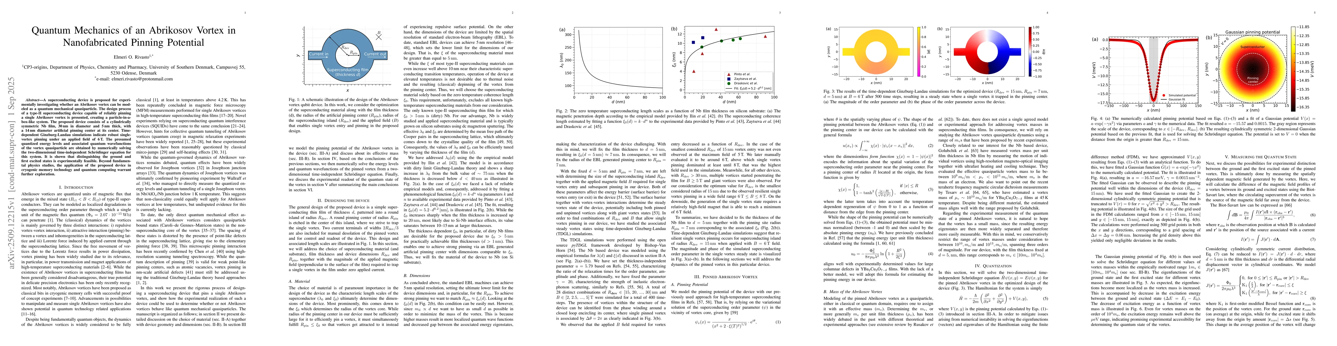 A superconducting device is proposed for experimentally investigating whether an Abrikosov vortex can be modeled as a quantum mechanical quasiparticle. The design process of a type-II superconducting device capable of reliably pinning a single Abrikosov vortex is presented, creating a particle-in-a-box-like system. The proposed device consists of a cylindrically symmetric Nb film, 30 nm in diameter and 5 nm thick, with a 14 nm diameter artificial pinning center at its center. Time-dependent Ginzburg-Landau simulations indicate robust single-vortex pinning under an applied field of 6 T. The presumed quantized energy levels and associated quantum wavefunctions of the vortex quasiparticle are obtained by numerically solving the two-dimensional time-independent Schr\"odinger equation for this system. It is shown that distinguishing the ground and first excited states is experimentally feasible. Beyond fundamental physics studies, the application of the proposed device in cryogenic memory technology and quantum computing warrant further exploration.
